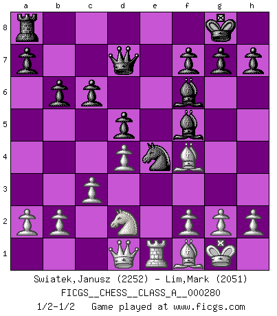 Last move : 1/2-1/2 2024 September 28 22:3:3 [Event "FICGS__CHESS__CLASS_A__000280"] [Site "FICGS"] [Date "2024.07.08"] [Round "1"] [White "Swiatek,Janusz"] [Black "Lim,Mark"] [Result "1/2-1/2"] [WhiteElo "2252"] [BlackElo "2051"] 1.e4 e5 2.Nf3 Nc6 3.Bb5 Nf6 4.O-O Nxe4 5.Re1 Nd6 6.Nxe5 Be7 7.Bf1 Nxe5 8.Rxe5 O-O 9.d4 Bf6 10.Re1 Re8 11.Bf4 Rxe1 12.Qxe1 Ne8 13.c3 d5 14.Nd2 Bf5 15.Qe2 Qd7 16.Re1 Nd6 17.Qd1 c6 18.Nb3 b6 19.Nd2 Ne4 1/2-1/2 Follow this game move after move (download)The way he plays Chess demonstrates a man's whole nature. (Stanley Ellin) Wenn du gegen Bobby spielst, ist es keine Frage von gewinnen oder verlieren. Es ist eine Frage des Überlebens. (Boris Vassilievich Spassky) Existen dos clases de sacrificios: los correctos y los míos. (Mikhail Tal) Vous savez, camarade Pachman, je n'éprouve pas de plaisir à être ministre, je jouerais plutôt aux échecs comme vous, ou alors ferais une révolution au Venezuela. (Che Guevara à Ludek Pachman, 'Checkmate in Prague', 1975) The message for business people contemplating their place in the cyberspace is simple and direct: get linked or get lost. (Vic Sussman and Kenan Pollack)