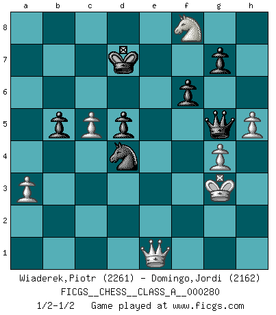 Last move : 1/2-1/2 2025 February 1 23:3:39 [Event "FICGS__CHESS__CLASS_A__000280"] [Site "FICGS"] [Date "2024.07.08"] [Round "1"] [White "Wiaderek,Piotr"] [Black "Domingo,Jordi"] [Result "1/2-1/2"] [WhiteElo "2261"] [BlackElo "2162"] 1.d4 d5 2.c4 dxc4 3.e4 Nf6 4.e5 Nd5 5.Bxc4 Nb6 6.Bd3 Nc6 7.Ne2 Bg4 8.f3 Be6 9.Nbc3 Qd7 10.Ne4 Bd5 11.Nc5 Qc8 12.Bd2 Nc4 13.Qc2 Nxd2 14.Qxd2 e6 15.Rc1 Bxa2 16.Be4 Bd5 17.Bxd5 exd5 18.O-O Bxc5 19.Rxc5 O-O 20.Nf4 Qf5 21.h4 h5 22.Kh2 Rad8 23.Rc3 a5 24.Rf2 f6 25.e6 Rfe8 26.g4 hxg4 27.fxg4 Qe4 28.Rd3 Rd6 29.Re2 Qh7 30.Rh3 a4 31.Qc1 Re7 32.Qg1 Nd8 33.Qf2 Nxe6 34.h5 Qh6 35.Ng6 Re8 36.Qf5 Kf7 37.Rhe3 Qg5 38.Kg3 c6 39.Re1 b6 40.Ne5+ Kg8 41.Ng6 Kf7 42.Qc2 b5 43.R3e2 a3 44.bxa3 c5 45.Qb1 R6d8 46.dxc5 Nd4 47.Rxe8 Rxe8 48.Rxe8 Kxe8 49.Qe1+ Kd7 50.Nf8+ 1/2-1/2 Follow this game move after move (download)What is the difference between chess and football? Everybody understands football, but nobody plays it. Everybody plays chess, but nobody understands it. Everything is relative. (Vladimir Kramnik) Um sich vor der Gefahr einer Erkältung zu schützen, sorge der wanderlustige König beizeiten für ein brauchbares Versteck. (Aaron Nimzowitsch) Desconfianza es la característica mas necesaria de un jugador de Ajedrez. (Siegbert Tarrasch) Aidez vos pièces, elles vous aideront. (Paul Morphy) Some people are so afraid to die that they never begin to live. (Henry Van Dyke)