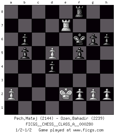 Last move : 1/2-1/2 2024 November 22 8:31:21 [Event "FICGS__CHESS__CLASS_A__000280"] [Site "FICGS"] [Date "2024.07.08"] [Round "1"] [White "Pech,Matej"] [Black "Ozen,Bahadir"] [Result "1/2-1/2"] [WhiteElo "2144"] [BlackElo "2239"] 1.d4 Nf6 2.c4 g6 3.Nc3 d5 4.cxd5 Nxd5 5.e4 Nxc3 6.bxc3 Bg7 7.Bc4 c5 8.Ne2 O-O 9.O-O Nc6 10.Be3 b6 11.Rc1 Bb7 12.Qd2 Rc8 13.Rfd1 e6 14.Bb5 a6 15.Bxc6 Bxc6 16.d5 exd5 17.exd5 Ba4 18.Re1 h6 19.Ng3 Qh4 20.Bf4 Rce8 21.Ne4 f5 22.Nd6 Rxe1+ 23.Rxe1 Bxc3 24.Qxc3 Qxf4 25.Re6 Qd4 26.Qxd4 cxd4 27.Kf1 Kg7 28.Ke2 Bb5+ 29.Nxb5 axb5 30.Re7+ Kf6 1/2-1/2 Follow this game move after move (download)You cannot play at Chess if you are kind-hearted. (French Proverb) Ich liebe den Moment, wenn ich das Ego meines Gegenüber breche. (Robert James Fischer) Si no le temes a Spassky, entonces elimino el elemento del dinero. (Jim Slater) Que feriez-vous si vous étiez en train de jouer aux échecs et que la fin du monde arrive ? Je continuerais à jouer. (Saint Borromée) He who laughs last probably does not get the joke. (Unknown)