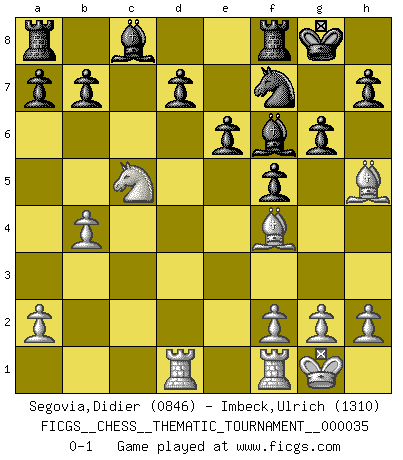 Last move : 0-1 2008 January 16 11:21:48 [Event "FICGS__CHESS__THEMATIC_TOURNAMENT__000035"] [Site "FICGS"] [Date "2007.09.20"] [Round "1"] [White "Segovia,Didier"] [Black "Imbeck,Ulrich"] [Result "0-1"] [WhiteElo "0846"] [BlackElo "1310"] 1.e4 c5 2.Nf3 e6 3.d4 cxd4 4.Nxd4 Bc5 5.c3 Qb6 6.Be2 Nc6 7.O-O Nxd4 8.cxd4 Bxd4 9.Qb3 Ne7 10.Nc3 f5 11.Qxb6 Bxb6 12.e5 Ng6 13.Bh5 O-O 14.b4 Nxe5 15.Bf4 Nf7 16.Na4 Bd4 17.Rad1 Bf6 18.Nc5 g6 0-1 Sicilian defense Kingside Castling by player White (move 7) Kingside Castling by player Black (move 13) Player Black won this chess game. Follow this game move after move (download)I thought the most common mistake [in chess] was the first one: Learning the game :P (Garvin Gray, FICGS forum) Wie, soll nun auch die Opposition abgeschafft werden? Ja, es tut mir leid, Ihnen diesen Schmerz nicht ersparen zu können. (Aaron Nimzowitsch) Debes de llevar a tu oponente hacia un profundo y obscuro bosque donde 2+2=5, y el camino que conduce a la salida es suficientemente ancho para solamente uno. (Mikhail Tal) A chaque perte on perd un peu de soi. (Joël Lautier) They misunderestimated me. (George W. Bush, Bentonville nov. 6, 2000)
