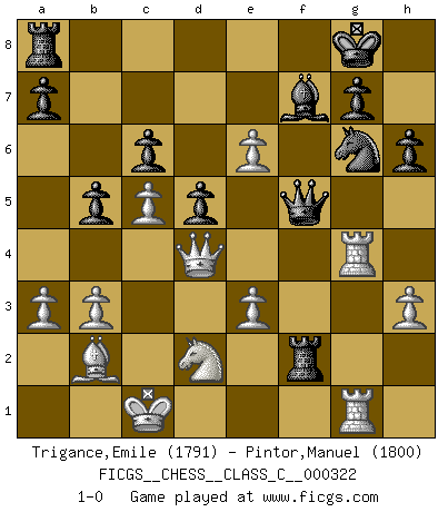 Last move : 1-0 2024 September 4 22:28:52 [Event "FICGS__CHESS__CLASS_C__000322"] [Site "FICGS"] [Date "2024.07.14"] [Round "1"] [White "Trigance,Emile"] [Black "Pintor,Manuel"] [Result "1-0"] [WhiteElo "1791"] [BlackElo "1800"] 1.Nf3 Nc6 2.b3 d5 3.Bb2 Bf5 4.d3 e6 5.Nbd2 f6 6.Nh4 Bg4 7.h3 Bh5 8.g4 Bf7 9.Nhf3 Bd6 10.e3 Nge7 11.c4 O-O 12.a3 Ng6 13.d4 h6 14.Qc2 f5 15.gxf5 exf5 16.Qxf5 Nce7 17.Qc2 c6 18.Bd3 Be8 19.Rg1 Rf6 20.O-O-O Qd7 21.Rg4 Bf7 22.c5 Bc7 23.Rdg1 b5 24.Ne5 Bxe5 25.dxe5 Rxf2 26.Qc3 Qe6 27.Qd4 Nf5 28.Bxf5 Qxf5 29.e6 1-0 Follow this game move after move (download)A Chess game is a dialogue, a conversation between a player and his opponent. Each move by the opponent may contain threats or be a blunder, but a player cannot defend against threats or take advantage of blunders if he does not first ask himself: What is my opponent planning after each move ? (Bruce A. Moon) Ich bin der einzige Schachspieler, der sich während der Vorbereitungen zum Turnier verletzt hat. (Woody Allen) Cuando veas una buena jugada, trata de encontrar otra mejor. (Emanuel Lasker) Votre prénom est 'Tactique', votre deuxième prénom est 'Tactique' et votre nom est 'Tactique'. (Ken Smith) Art is the triumph over chaos. (John Cheever)