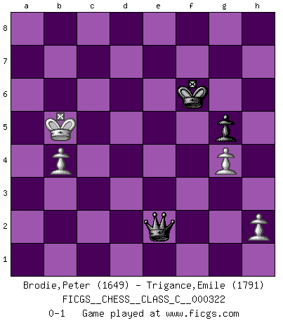 Last move : 0-1 2025 April 11 16:8:54 [Event "FICGS__CHESS__CLASS_C__000322"] [Site "FICGS"] [Date "2024.07.14"] [Round "1"] [White "Brodie,Peter"] [Black "Trigance,Emile"] [Result "0-1"] [WhiteElo "1649"] [BlackElo "1791"] 1.d4 e6 2.Nf3 d5 3.Bf4 Bd6 4.Nc3 Bxf4 5.e3 Bd6 6.Be2 c6 7.O-O Qc7 8.Qd2 Bb4 9.a3 Bxc3 10.Qxc3 Nf6 11.Ne5 O-O 12.f3 Nfd7 13.f4 Nxe5 14.dxe5 Nd7 15.Rad1 f5 16.exf6 Nxf6 17.b4 b6 18.Bd3 Bb7 19.Qe5 Qxe5 20.fxe5 Ng4 21.Rxf8+ Rxf8 22.Rf1 Nxe3 23.Bxh7+ Kxh7 24.Rxf8 Nxc2 25.Rf7 Ba6 26.Rxa7 Bc4 27.Rc7 b5 28.Rxc6 d4 29.Ra6 d3 30.Kf2 Bd5 31.Rd6 Nxa3 32.Ke3 Nc4+ 33.Kxd3 Nxd6 34.exd6 Bc6 35.g3 Kg6 36.Kd4 Kf6 37.Kc5 Be8 38.g4 g5 39.Kb6 e5 40.Kc7 e4 41.d7 Bxd7 42.Kxd7 e3 43.Kd6 e2 44.Kc5 e1Q 45.Kxb5 Qe2+ 0-1 Follow this game move after move (download)Strategy requires thought, tactics require observation. (Max Euwe) Kasparov stellt für gewöhnlich die Regeln auf und bricht sie dann selbst wieder. (Alexej Shirov) Hay jugadores fuertes y personas amables y yo soy un jugador fuerte. (Bobby Fischer) Vous n'êtes pas toujours obligé de jouer le meilleur coup. Un coup doit être actif, entreprenant, correct et beau ! (David Bronstein) If you know the enemy and know yourself you need not fear the results of a hundred battles. (Sun Tzu)