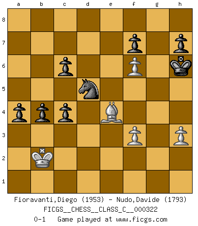 Last move : 0-1 2025 February 9 20:24:12 [Event "FICGS__CHESS__CLASS_C__000322"] [Site "FICGS"] [Date "2024.07.14"] [Round "1"] [White "Fioravanti,Diego"] [Black "Nudo,Davide"] [Result "0-1"] [WhiteElo "1953"] [BlackElo "1793"] 1.Nf3 d5 2.d4 c6 3.c4 Nf6 4.e3 Bg4 5.h3 Bxf3 6.Qxf3 e6 7.Nc3 Bb4 8.Bd3 O-O 9.O-O Nbd7 10.e4 dxc4 11.Bc2 e5 12.Rd1 exd4 13.Rxd4 Ne5 14.Qd1 Qe7 15.Bf4 Bc5 16.Bxe5 Qxe5 17.Rd2 b5 18.Qf3 Rad8 19.Rad1 Rxd2 20.Rxd2 Re8 21.g3 g6 22.Qf4 Qxf4 23.gxf4 Bb4 24.f3 Nh5 25.f5 gxf5 26.Rg2+ Kh8 27.Ne2 Rd8 28.exf5 Rd2 29.Nc3 Rxg2+ 30.Kxg2 Bxc3 31.bxc3 Nf4+ 32.Kf1 Nd5 33.Kf2 Nxc3 34.Ke3 Nxa2 35.Kd4 Nb4 36.Be4 a5 37.Kc3 Nd5+ 38.Kb2 Kg7 39.f6+ Kh6 40.Ka3 b4+ 41.Kb2 a4 0-1 Follow this game move after move (download)It's always better to sacrifice your opponent's men. (Savielly Tartakover) Man wirke der falschen Auffassung entgegen, als ob jeder Zug Unmittelbares zu leisten habe; auch Werte- und Ruhezüge haben ihre Existenzberechtigung. (Aaron Nimzowitsch) El Ajedrez es sobre todo, ¡una pelea!. (Emanuel Lasker) Un footballeur joue avec ses pieds, parfois avec sa tête. Un joueur d'échecs ne joue qu'avec sa tête. Et quand il ne joue plus, il meurt. (Jacob Murray) Excelling at chess has long been considered a symbol of more general intelligence. That is an incorrect assumption in my view, as pleasant as it might be. But for the purposes of argument and investigation, chess is, in Russkin-Gutman's words, 'an unparalleled laboratory, since both the learning process and the degree of ability obtained can be objectified and quantified, providing an excellent comparative framework on which to use rigorous analytical techniques.' (The Chess Master and the Computer, by Garry Kasparov - 2010)