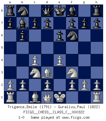 Last move : 1-0 2024 September 19 10:0:30 [Event "FICGS__CHESS__CLASS_C__000322"] [Site "FICGS"] [Date "2024.07.14"] [Round "1"] [White "Trigance,Emile"] [Black "Guralivu,Paul"] [Result "1-0"] [WhiteElo "1791"] [BlackElo "1822"] 1.Nf3 Nf6 2.c4 e6 3.Nc3 b6 4.e4 Bb7 5.Bd3 1-0 This chess game has been lost on time (started : 2024.07.14 16:24:19) Follow this game move after move (download)Chess is so inspiring that I do not believe a good player is capable of having an evil thought during the game. (Wilhelm Steinitz) Kleine Schachspieler machen Mist, und große Schachspieler machen Mist, aber große machen weniger Mist. (Fritz Sämisch) Nada excita más a Grandes Maestros aburridos que una novedad teórica. (Dominic Lawson) Il vaut toujours mieux jouer un plan faux de façon logique que de n'avoir pas de plan du tout. (Victor Kortchnoï) Mac users swear by their computers. PC users swear at their computers. (Author unknown)
