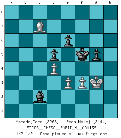 Last move : 1/2-1/2 2024 November 27 23:30:46 [Event "FICGS__CHESS__RAPID_M__000159"] [Site "FICGS"] [Date "2024.07.20"] [Round "1"] [White "Maceda,Coco"] [Black "Pech,Matej"] [Result "1/2-1/2"] [WhiteElo "2266"] [BlackElo "2144"] 1.Nf3 Nf6 2.d4 d5 3.c4 c6 4.cxd5 cxd5 5.Nc3 Nc6 6.Bf4 Bf5 7.e3 e6 8.Qb3 Bb4 9.Bb5 O-O 10.O-O Bxc3 11.Bxc6 Bxb2 12.Bxb7 Bxa1 13.Rxa1 Ne4 14.Rc1 Qb6 15.Bxa8 Rxa8 16.h4 f6 17.Nh2 Qxb3 18.axb3 Nd2 19.Rc3 a5 20.Nf1 Nxf1 21.Kxf1 h5 22.Kg1 Ra6 23.Kh2 Rb6 24.Rc5 Rxb3 25.Rxa5 Rb7 26.Kg3 Kh7 27.Ra3 Kg6 28.Ra6 Kf7 29.Rc6 Bd3 30.Rc7+ Rxc7 31.Bxc7 g5 32.hxg5 fxg5 33.Bd8 Kg6 34.f3 h4+ 35.Kf2 Kh5 36.g4+ hxg3+ 37.Kxg3 Kg6 38.Bc7 Kf5 39.Bd6 Bc2 40.Bc7 Bb1 41.Bb8 Bc2 42.Bc7 Bb1 43.Bb8 Bc2 44.Bc7 1/2-1/2 Follow this game move after move (download)If I win a tournament, I win it by myself. I do the playing. Nobody helps me. (Bobby Fischer) Die jungen Leute sollen verstehen, dass sie noch etwas von mir lernen können und müssen. (Viktor Kortschnoi) Mis oponentes también hacen buenas movidas. A veces yo no tomo esas cosas en consideración. (Bobby Fischer) Vous n'êtes pas toujours obligé de jouer le meilleur coup. Un coup doit être actif, entreprenant, correct et beau ! (David Bronstein) Either move or be moved. (Ezra Pound)