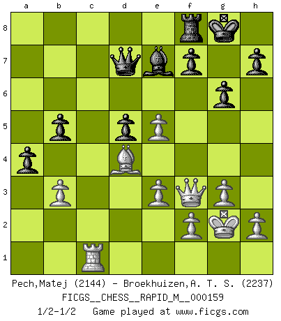 Last move : 1/2-1/2 2024 November 19 3:8:56 [Event "FICGS__CHESS__RAPID_M__000159"] [Site "FICGS"] [Date "2024.07.20"] [Round "1"] [White "Pech,Matej"] [Black "Broekhuizen,A. T. S."] [Result "1/2-1/2"] [WhiteElo "2144"] [BlackElo "2237"] 1.d4 Nf6 2.c4 e6 3.Nf3 b6 4.g3 Ba6 5.b3 c5 6.Bg2 d5 7.Nc3 Nc6 8.O-O Be7 9.cxd5 Nxd5 10.Nxd5 exd5 11.Bb2 O-O 12.Qd2 c4 13.Bc3 Rc8 14.Rfd1 cxb3 15.axb3 Bb5 16.Ne5 a5 17.e3 Nb4 18.Bh3 Rc7 19.Rdc1 g6 20.Qd1 Nc6 21.Bb2 Nb4 22.Bc3 Nc6 23.Qf3 Nxe5 24.dxe5 Bd7 25.Bxd7 Qxd7 26.Bd4 Rxc1+ 27.Rxc1 b5 28.Kg2 a4 1/2-1/2 Follow this game move after move (download)In a gambit you give up a Pawn for the sake of getting a lost game. (Samuel Standige Boden) Kritik überlasse ich den Spießern. Ich zeige nichts, wofür ich mich schämen muss. (Alexandra Kosteniuk) Para mi, el Ajedrez es la vida y cada partida es como una nueva vida. Todo jugador de Ajedrez suele vivir muchas vidas durante su vida. (Eduard Gufeld) Aux échecs, les retours au sommet sont rares : les dommages psychologiques consécutifs à une défaite sont trop sévères. (Daily Telegraph) Memory is a way of holding onto the things you love, the things you are, the things you never want to lose. (from the television show: The Wonder Years)