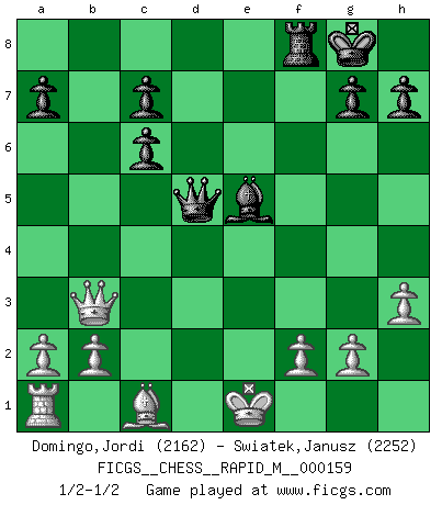 Last move : 1/2-1/2 2024 September 16 0:23:44 [Event "FICGS__CHESS__RAPID_M__000159"] [Site "FICGS"] [Date "2024.07.20"] [Round "1"] [White "Domingo,Jordi"] [Black "Swiatek,Janusz"] [Result "1/2-1/2"] [WhiteElo "2162"] [BlackElo "2252"] 1.e4 e5 2.Nf3 Nc6 3.Bc4 Bc5 4.c3 Nf6 5.d4 exd4 6.e5 d5 7.Bb5 Ne4 8.cxd4 Bb6 9.h3 O-O 10.O-O f6 11.Nc3 fxe5 12.Bxc6 bxc6 13.Nxe4 dxe4 14.Qb3+ Qd5 15.Nxe5 Ba6 16.Rd1 Be2 17.Re1 Bxd4 18.Rxe2 Bxe5 19.Rxe4 Rae8 20.Re1 Bh2+ 21.Kf1 Rxe1+ 22.Kxe1 Be5 1/2-1/2 Follow this game move after move (download)If your opponent cannot do anything active, then don't rush the position; instead you should let him sit there, suffer, and beg you for a draw. (Jeremy Silman) Ich moechte nie einem Club beitreten, der Leute wie mich als Mitglieder aufnimmt. (Woody Allen) Preferería tener un Peón que un dedo. (Reuben Fine) Pour se monter efficace, un Cavalier a besoin d'avant-postes ! Les Cavaliers font les meilleurs bloqueurs de pions passés. Those who make the worst use of their time are the first to complain of its brevity. (Jean de la Bruyere)