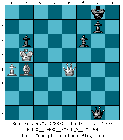Last move : 1-0 2025 February 14 16:20:7 [Event "FICGS__CHESS__RAPID_M__000159"] [Site "FICGS"] [Date "2024.07.20"] [Round "1"] [White "Broekhuizen,A. T. S."] [Black "Domingo,Jordi"] [Result "1-0"] [WhiteElo "2237"] [BlackElo "2162"] 1.e4 e5 2.Nf3 d6 3.d4 exd4 4.Nxd4 Nf6 5.Nc3 Be7 6.Bf4 O-O 7.Qd2 d5 8.Ndb5 Bb4 9.O-O-O c6 10.Nc7 Nxe4 11.Qd4 Bxc3 12.bxc3 Qe7 13.c4 Qa3+ 14.Qb2 Qa5 15.cxd5 Nxf2 16.Be2 Na6 17.Nxa8 Nxh1 18.Rxh1 Nb4 19.Bc4 Qc5 20.Bd2 Nxd5 21.Bxd5 Qxd5 22.Bf4 Bf5 23.Nc7 Qxg2 24.Rd1 h5 25.Qc3 Bg6 26.Kb2 Qg4 27.Qd4 Qf5 28.Rd2 Rc8 29.Rf2 Qa5 30.a3 Kh7 31.Qb4 Qf5 32.Bg3 Qg5 33.Re2 Qf5 34.Qd2 h4 35.Be5 f6 36.Bd6 Rd8 37.Qb4 h3 38.Bg3 Rd1 39.Ne6 Bf7 40.Nc5 b6 41.Nd3 Kg8 42.Re1 Rxe1 43.Qxe1 c5 44.Qe7 Qd5 45.Qxa7 c4 46.Nc1 Qb5+ 47.Kc3 Bg6 48.Na2 Bxc2 49.Nb4 Bg6 50.Qa6 Qf5 51.Qxc4+ Kh7 52.Qh4+ Kg8 53.Qf4 Qb1 54.Qe3 Qf1 55.Nc2 Kh8 56.Nd4 Bf7 57.Qd3 Qa1+ 58.Kd2 Qg1 59.Nc2 Qg2+ 60.Kc3 Qc6+ 61.Kb2 Bg8 62.Bf2 Qg2 63.Qg3 Qf1 64.a4 Qa6 65.Qxh3+ Bh7 66.Qd7 Bxc2 67.Qe8+ Kh7 68.Kxc2 Qc4+ 69.Kd2 Qb4+ 70.Ke2 Qc4+ 71.Kf3 Qd3+ 72.Kg2 Qd5+ 73.Kg1 Qg5+ 74.Kf1 Qc1+ 75.Be1 Qc4+ 76.Kf2 Qf4+ 77.Kg2 Qg5+ 78.Kf3 Qf5+ 79.Ke3 Qc5+ 80.Kd3 Qd6+ 81.Kc4 Qxh2 82.Qe4+ Kg8 83.Kb5 Qg1 84.Bb4 1-0 Follow this game move after move (download)Chess teaches you to control the initial excitement you feel when you see something that looks good and it trains you to think objectively when you're in trouble. (Stanley Kubrick) Als er Schachweltmeister wurde ließ er praktisch alle stärksten Sovietspieler für sich arbeiten. Wenn ein auch nur mittelmässiger Meister ein Spezialist für eine bestimmte Eröffnung war, wurde er von Karpov gerufen. Das wurde alles geheim gehalten. (Mikhail Moiseyevich Botvinik) Debes de llevar a tu oponente hacia un profundo y obscuro bosque donde 2+2=5, y el camino que conduce a la salida es suficientemente ancho para solamente uno. (Mikhail Tal) A chaque perte on perd un peu de soi. (Joël Lautier) Don't be irreplaceable, if you can't be replaced, you can't be promoted. (Dan Rotaru)