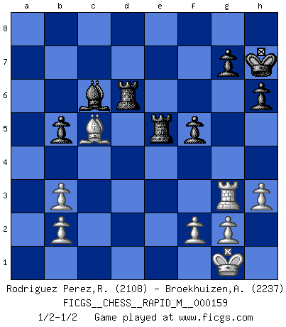 Last move : 1/2-1/2 2024 November 11 22:59:18 [Event "FICGS__CHESS__RAPID_M__000159"] [Site "FICGS"] [Date "2024.07.20"] [Round "1"] [White "Rodriguez Perez,Rene"] [Black "Broekhuizen,A. T. S."] [Result "1/2-1/2"] [WhiteElo "2108"] [BlackElo "2237"] 1.e4 e5 2.Nf3 Nc6 3.Bc4 Nf6 4.d3 a6 5.Ng5 d5 6.exd5 Na5 7.O-O h6 8.Nf3 Bd6 9.Nbd2 b5 10.Bb3 O-O 11.Re1 Nxb3 12.axb3 Nxd5 13.Nxe5 c5 14.c4 Nb4 15.Ndf3 Bb7 16.Bd2 Bxe5 17.Nxe5 Nxd3 18.Nxd3 Qxd3 19.Re3 Qf5 20.Qe2 Bc6 21.Rg3 Rfe8 22.Be3 Re6 23.cxb5 axb5 24.Rd1 Rae8 25.h3 Kh7 26.Qd3 Qxd3 27.Rxd3 f5 28.Rd2 Re5 29.Rd6 R8e6 30.Bxc5 Rxd6 1/2-1/2 Follow this game move after move (download)Chess is war over the board. The object is to crush the opponents mind. (Bobby Fischer) Ohne Leiden bildet sich kein Charakter. (Ernst Freiherr von Feuchtersleben) El Ajedrez hace al hombre ser mas sabio y ver mas claro. (Vladimir Putin) Je crois qu'il existe des manières très spécifiques de jouer efficacement contre une machine. Evidemment, nous n'avons aucune chance en technique pure, parce que l'ordinateur calcule de manière parfaite. Mais lorsque nous faisons appel à notre cerveau, en utilisant l'intuition et la compréhension, alors nous restons beaucoup plus forts. (Anatoli Karpov) A good teacher is like a candle - it consumes itself to light the way for others. (Author unknown)