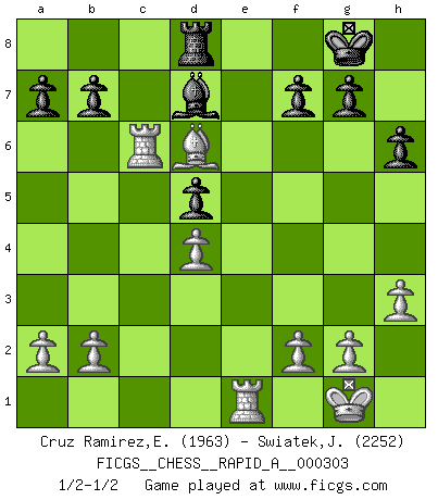Last move : 1/2-1/2 2024 October 11 20:25:46 [Event "FICGS__CHESS__RAPID_A__000303"] [Site "FICGS"] [Date "2024.07.30"] [Round "1"] [White "Cruz Ramirez,Eliecer"] [Black "Swiatek,Janusz"] [Result "1/2-1/2"] [WhiteElo "1963"] [BlackElo "2252"] 1.e4 c5 2.c3 d5 3.exd5 Qxd5 4.Nf3 Nf6 5.d4 Nc6 6.Be2 cxd4 7.cxd4 e6 8.Nc3 Qd6 9.O-O Be7 10.Nb5 Qd8 11.Bf4 Nd5 12.Bg3 O-O 13.Rc1 Bd7 14.Nd6 Bxd6 15.Bxd6 Re8 16.Re1 h6 17.h3 Rc8 18.Qd2 Qb6 19.Bc5 Qc7 20.Bc4 Qf4 21.Qxf4 Nxf4 22.Bd6 Nd5 23.Ne5 Red8 24.Bxd5 exd5 25.Nxc6 Rxc6 26.Rxc6 1/2-1/2 Follow this game move after move (download)You can only get good at Chess if you love the game. (Bobby Fischer) Ich verachte die Medien. (Robert James Fischer) Una partida de Ajedrez se divide en 3 etapas: la primera cuando piensas que tienes la ventaja, la segunda cuando crees que tienes la ventaja y la tercera... ¡cuando te das cuenta que vas a perder!. (Savielly Tartakower) Aux échecs, l'amour-propre est satisfait quand on remporte la victoire, mais il n'y a pas de honte à être battu. (Benjamin Franklin) When you have everything, sometimes it feels like nothing. (Horatio Caine, C.S.I. Miami)