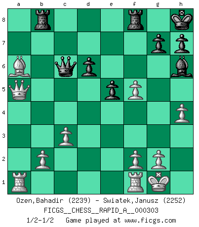 Last move : 1/2-1/2 2024 September 15 21:34:3 [Event "FICGS__CHESS__RAPID_A__000303"] [Site "FICGS"] [Date "2024.07.30"] [Round "1"] [White "Ozen,Bahadir"] [Black "Swiatek,Janusz"] [Result "1/2-1/2"] [WhiteElo "2239"] [BlackElo "2252"] 1.e4 c5 2.Nf3 Nc6 3.d4 cxd4 4.Nxd4 Nf6 5.Nc3 e5 6.Ndb5 d6 7.Bg5 a6 8.Na3 b5 9.Nd5 Be7 10.Bxf6 Bxf6 11.c3 Bg5 12.Nc2 Ne7 13.h4 Bh6 14.a4 bxa4 15.Ncb4 O-O 16.Qxa4 Nxd5 17.Nxd5 Kh8 18.Qa5 Qd7 19.Be2 Rb8 20.O-O f5 21.Nb6 Qe8 22.Nxc8 Qxc8 23.Bxa6 Qc6 24.exf5 1/2-1/2 Follow this game move after move (download)Robert Fischer is a law unto himself. (Larry Evans) Ich suche im Schach immer etwas Eigenes. Riskantes Spiel im Stile schachlicher Musketiere ist nicht meine Sache, auch wenn es vielen Freunden scharfer Wendungen gefällt. (Anatoly Karpov) Yo nunca en mi vida he jugado la Defensa Francesa, que viene siendo la más aburrida de todas las Aperturas. (Wilhelm Steinitz) Shah mat. Le roi est mort. Cri de fierté d'un joueur venant de terrasser son adversaire, courtoisement, sans effusion de sang. Knowledge rests not upon truth alone, but upon error also. (Carl G. Jung)
