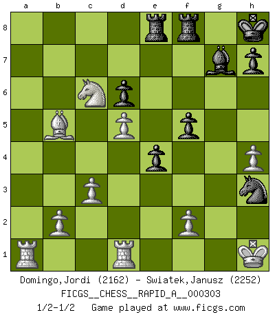 Last move : 1/2-1/2 2024 October 13 22:18:2 [Event "FICGS__CHESS__RAPID_A__000303"] [Site "FICGS"] [Date "2024.07.30"] [Round "1"] [White "Domingo,Jordi"] [Black "Swiatek,Janusz"] [Result "1/2-1/2"] [WhiteElo "2162"] [BlackElo "2252"] 1.e4 c5 2.Nf3 Nc6 3.d4 cxd4 4.Nxd4 Nf6 5.Nc3 e5 6.Ndb5 d6 7.Bg5 a6 8.Na3 b5 9.Bxf6 gxf6 10.Nd5 f5 11.Bd3 Be6 12.c3 Bg7 13.Qh5 O-O 14.O-O f4 15.Rfd1 Kh8 16.Nc2 Ne7 17.a4 Bxd5 18.exd5 f5 19.axb5 e4 20.Bf1 axb5 21.Nb4 Ng6 22.Nc6 Qc8 23.Kh1 Ne5 24.Ne7 Qe8 25.Qxe8 Raxe8 26.Nc6 f3 27.gxf3 Nxf3 28.Bxb5 Ng5 29.h4 Nh3 1/2-1/2 Follow this game move after move (download)Let the perfectionist play postal. (Yasser Seirawan) Wenn Capablanka heute auf der Schachbühne erscheinen würde, hätte er ein halbes Jahr gebraucht um sich die Schachtheorie anzueignen. Und dann hätte er alles und jeden besiegt. (Mikhail Moiseyevich Botvinik) En el Ajedrez, cuando menos, el valiente hereda la tierra. (Edmar Mednis) Aidez vos pièces, elles vous aideront. (Paul Morphy) Even the best needles are not sharp at both ends. (Chinese proverb)