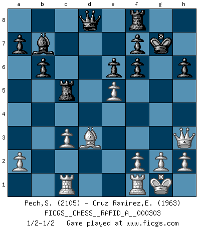 Last move : 1/2-1/2 2024 October 5 23:43:2 [Event "FICGS__CHESS__RAPID_A__000303"] [Site "FICGS"] [Date "2024.07.30"] [Round "1"] [White "Pech,Stepan"] [Black "Cruz Ramirez,Eliecer"] [Result "1/2-1/2"] [WhiteElo "2105"] [BlackElo "1963"] 1.d4 Nf6 2.c4 e6 3.Nc3 Bb4 4.e3 O-O 5.Bd3 d5 6.Nf3 dxc4 7.Bxc4 c5 8.O-O cxd4 9.exd4 b6 10.Bg5 Bb7 11.Qe2 Bxc3 12.bxc3 Nbd7 13.Ne5 Rc8 14.Rac1 Nxe5 15.dxe5 Rc5 16.Bd3 h6 17.Bxf6 gxf6 18.Qg4+ Kh8 19.Qh3 Kg7 20.Qg3+ Kh8 21.Qh3 Kg7 1/2-1/2 Follow this game move after move (download)Many Chess players were surprised when after the game, Fischer quietly explained: 'I had already analyzed this possibility' in a position which I thought was not possible to foresee from the opening. (Mikhail Tal) Die größte Kunst beim Schach besteht darin dem Gegner nicht zu zeigen was er tun kann. (Garry Kasparov) No nos podemos resistir a la fascinación de un sacrificio ya que la pasión por los sacrificios es parte de la naturaleza de un jugador de Ajedrez. (Rudolf Spielman) Les pièces de l'échiquier étaient impitoyables. Elles le retenaient, elles l'absorbaient. Il y avait de l'horreur en cela, mais aussi une harmonie unique. Car, qu'y a-t-il dans le monde, à part les échecs ? (V. Nabokov) If everyone is thinking alike, then somebody isn't thinking. (US General George S. Patton)