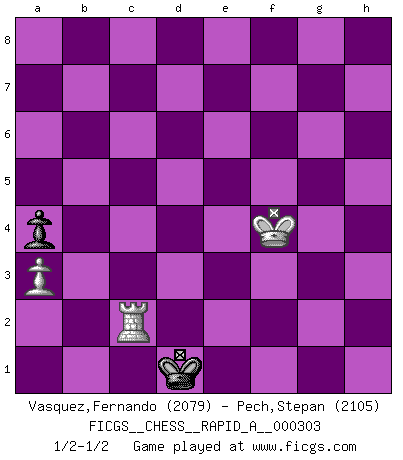 Last move : 1/2-1/2 2024 December 19 1:41:39 [Event "FICGS__CHESS__RAPID_A__000303"] [Site "FICGS"] [Date "2024.07.30"] [Round "1"] [White "Vasquez,Fernando"] [Black "Pech,Stepan"] [Result "1/2-1/2"] [WhiteElo "2079"] [BlackElo "2105"] 1.e4 c5 2.c3 Nf6 3.e5 Nd5 4.d4 cxd4 5.Nf3 Nc6 6.cxd4 d6 7.Bc4 Nb6 8.Bb5 dxe5 9.Nxe5 Bd7 10.Nxd7 Qxd7 11.Nc3 e6 12.O-O a6 13.Bxc6 Qxc6 14.Be3 Nd5 15.Rc1 Be7 16.Qf3 Nxc3 17.Qxc6+ bxc6 18.Rxc3 Kd7 19.Bf4 a5 20.Rfc1 Rhc8 21.R1c2 a4 22.h3 g6 23.Bh2 g5 24.g4 f6 25.Kg2 Ra5 26.Bg3 Ra6 27.f4 gxf4 28.Bxf4 Rg8 29.Kf3 Bb4 30.Rc4 Bd6 31.Bxd6 Kxd6 32.Rc5 Rg5 33.Kf4 Rxc5 34.Rxc5 Rb6 35.Rc2 Rb5 36.h4 Rb4 37.Ke3 e5 38.dxe5+ fxe5 39.Rg2 c5 40.h5 h6 41.a3 Rf4 42.g5 hxg5 43.Rxg5 Kd5 44.h6 Rh4 45.Rg6 Rh3+ 46.Kf2 Kd4 47.Kg2 Rh5 48.Rd6+ Ke3 49.Kg3 e4 50.Kg4 Rh2 51.Kg5 Rxb2 52.h7 Rb8 53.Rc6 Kd4 54.Rd6+ Ke3 55.Rc6 Rh8 56.Kg6 Kd4 57.Kg7 Rxh7+ 58.Kxh7 c4 59.Rd6+ Kc3 60.Kg6 e3 61.Kg5 e2 62.Re6 Kd2 63.Rd6+ Kc1 64.Re6 Kd2 65.Kf4 c3 66.Rd6+ Kc1 67.Re6 c2 68.Rxe2 Kd1 69.Rxc2 1/2-1/2 Follow this game move after move (download)We must make sure that Chess will not be like a dead language, very interesting, but for a very small group. (Sytze Faber) Wie ich sie so einen nach dem anderen nieder mähte wurde meine Überlegenheit offensichtlich. (José Raúl Capablanca) El juego de Damas es para vagabundos. (Paul Morphy) Des points faibles ou des trous dans la position de l'adversaire doivent être occupés par des pièces et non pas par des pions. (Siegbert Tarrasch) Memory... is the diary that we all carry with us. (Oscar Wilde, The Importance of Being Earnest)