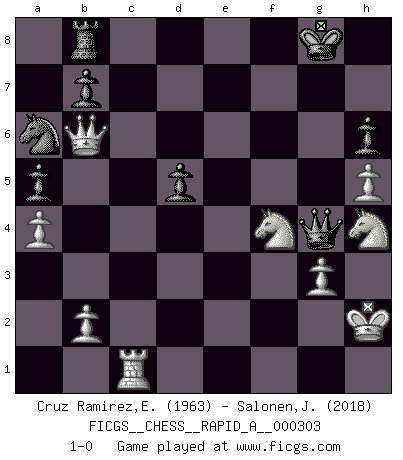 Last move : 1-0 2024 October 29 7:40:15 [Event "FICGS__CHESS__RAPID_A__000303"] [Site "FICGS"] [Date "2024.07.30"] [Round "1"] [White "Cruz Ramirez,Eliecer"] [Black "Salonen,Jukka"] [Result "1-0"] [WhiteElo "1963"] [BlackElo "2018"] 1.e4 e5 2.Nf3 Nc6 3.Bc4 Bc5 4.c3 Nf6 5.d3 a6 6.O-O Ba7 7.Re1 d6 8.a4 Ng4 9.Re2 Nf6 10.Nbd2 O-O 11.Nf1 h6 12.Be3 Nh5 13.Bxa7 Rxa7 14.Ne3 Nf4 15.Rd2 Na5 16.Ba2 Nc6 17.h4 Qf6 18.d4 exd4 19.cxd4 Re8 20.Bb1 a5 21.g3 Ng6 22.h5 Nf8 23.Nh4 Ra8 24.Ra3 Nb4 25.f4 d5 26.e5 Qb6 27.Rb3 Rd8 28.Kh2 Ne6 29.f5 Ng5 30.Nf3 Nh7 31.Rc3 Bd7 32.f6 gxf6 33.Rf2 Rab8 34.Qd2 Be6 35.Ng2 Bg4 36.Nfh4 fxe5 37.Bxh7+ Kxh7 38.Rxf7+ Kg8 39.R3xc7 Rd7 40.Rfxd7 Bxd7 41.Rxd7 Qe6 42.Rc7 Na6 43.Rc1 exd4 44.Qxd4 Qe4 45.Qb6 Qg4 46.Nf4 1-0 Follow this game move after move (download)Chess is the art of analysis. (Mikhail Botvinnik) Kein Schachspieler kann gut schlafen. (H. G. Wells) La esencia del Ajedrez es pensar acerca de lo que el Ajedrez es. (David Bronstein) Karpov est une pièce de musée. (Garry Kasparov) Games, world of games... There's always an opponent, and there's always a victim. (Revolver, movie)