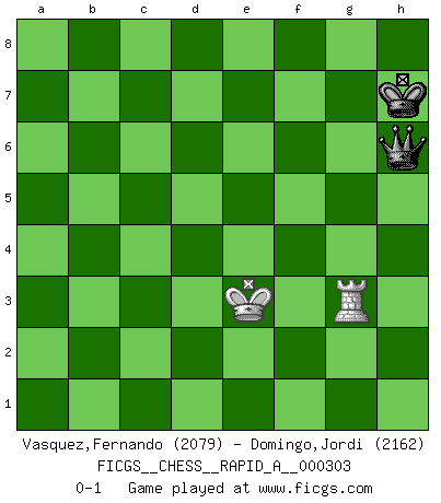 Last move : 0-1 2025 January 9 7:18:19 [Event "FICGS__CHESS__RAPID_A__000303"] [Site "FICGS"] [Date "2024.07.30"] [Round "1"] [White "Vasquez,Fernando"] [Black "Domingo,Jordi"] [Result "0-1"] [WhiteElo "2079"] [BlackElo "2162"] 1.e4 e5 2.Nf3 d6 3.d4 exd4 4.Nxd4 Nf6 5.Nc3 Be7 6.Bf4 O-O 7.Qd2 d5 8.Ndb5 Bb4 9.O-O-O c6 10.Nc7 Nxe4 11.Qe3 Nxc3 12.bxc3 Ba3+ 13.Kb1 Na6 14.Nxa8 Qa5 15.Bxa6 bxa6 16.Ka1 Be6 17.Qd3 Rxa8 18.Rhe1 Qa4 19.Bg3 Bf8 20.Rb1 c5 21.c4 d4 22.Qb3 Qa5 23.h4 Rc8 24.h5 h6 25.Re2 Bg4 26.f3 Bxh5 27.Be1 Qd8 28.Qb7 Bg6 29.Ba5 Qf6 30.Rb2 Bf5 31.Bc7 h5 32.Be5 Qg5 33.Rb1 h4 34.Qxa6 Qe7 35.Rbe1 Qd7 36.Qb5 Rc6 37.Bh2 f6 38.Re8 d3 39.cxd3 Qxd3 40.Bg1 Rc8 41.R8e2 Qc3+ 42.Qb2 Qxc4 43.Qb3 Qf7 44.Re8 c4 45.Qe3 Rxe8 46.Qxe8 Qd5 47.Bxa7 Qd2 48.Qe3 Qxg2 49.Bc5 Bxc5 50.Qxc5 Qc2 51.Qe3 Kh7 52.Rc1 Qd3 53.Qxd3 Bxd3 54.Kb2 Be2 55.Rh1 g5 56.Rh3 Bf1 57.Rh2 h3 58.a4 f5 59.a5 g4 60.a6 c3+ 61.Kxc3 Bxa6 62.Kd4 Bf1 63.fxg4 fxg4 64.Ke3 g3 65.Rh1 Bg2 66.Rg1 h2 67.Rxg2 h1Q 68.Rxg3 Qh6+ 0-1 Follow this game move after move (download)Daring ideas are like Chess men moved forward. They may be beaten, but they may start a winning game. (Johann Wolfgang von Goethe) Die Fehler sind da, Sie warten nur darauf gemacht zu werden. (Savielly Grigorievitsch Tartakower) Yo he agregado estos principios a la ley: pongan los Caballos en acción antes de que los dos Alfiles sean desarrollados. (Emanuel Lasker) Les Echecs ne sont pas pour les âmes timides. Ils requièrent un homme entier, qui ne s'arrête pas aveuglément à ce qui a été déjà établi, mais qui tente individuellement de sonder les profondeurs du jeu. (W. Steinitz) Chess, like love, like music, has the power to make people happy. (Siegbert Tarrasch)