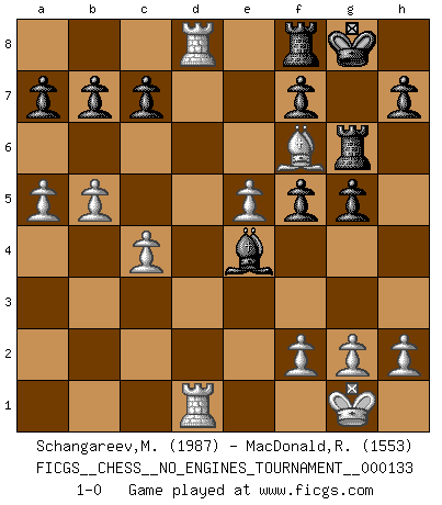 Last move : 1-0 2024 November 6 0:40:2 [Event "FICGS__CHESS__NO_ENGINES_TOURNAMENT__000133"] [Site "FICGS"] [Date "2024.07.30"] [Round "1"] [White "Schangareev,Mirzian"] [Black "MacDonald,Rob"] [Result "1-0"] [WhiteElo "1987"] [BlackElo "1553"] 1.e4 e6 2.d4 d5 3.Nc3 dxe4 4.Nxe4 Bd7 5.Nf3 Bc6 6.Bd3 Nd7 7.O-O Ngf6 8.Nc3 Be7 9.a4 O-O 10.Ne5 Nxe5 11.dxe5 Nd5 12.Qg4 Kh8 13.Qh3 g6 14.Bh6 Rg8 15.Ne4 Qe8 16.a5 Bf8 17.Bg5 Bg7 18.c4 Ne7 19.Nf6 Bxf6 20.Bxf6+ Rg7 21.Qh6 Qf8 22.b4 Nf5 23.Bxf5 exf5 24.b5 Be4 25.Rad1 Kg8 26.Rd7 g5 27.Rfd1 Rg6 28.Qxf8+ Rxf8 29.Rd8 1-0 Follow this game move after move (download)In Chess, as it is played by masters, chance is practically eliminated. (Emanuel Lasker) In Buenos Aires ist es nicht mein vorrangiges Ziel ein starkes Turnier zu organisieren, sondern ein Turnier für Gentlemen. Ich würde nie Kamsky einladen. Ich mag keine Probleme. (Miguel Najdorf) No nos podemos resistir a la fascinación de un sacrificio ya que la pasión por los sacrificios es parte de la naturaleza de un jugador de Ajedrez. (Rudolf Spielman) Le succès, c'est être capable d'aller d'échec en échec sans perdre son enthousiasme. (Winston Churchill) Wikichess, chess moves explained by 'experimented' players. (Thibault de Vassal)