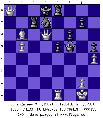 Last move : 1-0 2025 January 3 8:48:5 [Event "FICGS__CHESS__NO_ENGINES_TOURNAMENT__000133"] [Site "FICGS"] [Date "2024.07.30"] [Round "1"] [White "Schangareev,Mirzian"] [Black "Tedoldi,Guido"] [Result "1-0"] [WhiteElo "1987"] [BlackElo "1756"] 1.e4 c5 2.Nf3 d6 3.d4 cxd4 4.Nxd4 e5 5.Bb5+ Bd7 6.Nf5 Bxb5 7.Na3 Bc6 8.Nc4 Nf6 9.Nfxd6+ Bxd6 10.Nxd6+ Kf8 11.Be3 Nbd7 12.f3 Ne8 13.h3 Nxd6 14.Qxd6+ Ke8 15.a4 Qh4+ 16.Bf2 Qf4 17.b4 h5 18.b5 Bxe4 19.fxe4 Qxe4+ 20.Kf1 b6 21.Re1 Qc4+ 22.Kg1 f6 23.h4 Rf8 24.Rh3 Qxc2 25.Qe6+ Kd8 26.a5 Rc8 27.axb6 Re8 28.Qd6 Qf5 29.Rc3 Rxc3 30.bxa7 Rc8 31.Bb6+ Rc7 32.a8Q+ 1-0 Follow this game move after move (download)It is not a move, even the best move that you must seek, but a realizable plan. (Eugene Znosko-Borovsky) Ich habe Kasparov in Rente geschickt. (Veselin Topalov) El Ajedrez por encima de todo... ¡es una pelea!. (Emanuel Lasker) Roi des jeux et jeu des rois, les échecs portent en eux un sentiment d'infini. Ils donnent à celui qui s'est efforcé d'en approfondir les arcanes l'impression de n'être pas à la mesure de l'homme; en fait, ils constituent un résumé de l'univers, un microcosme, et figurent cette grande échelle qui, dans les plans de la lumière descend jusqu'à la matière, qui des abîmes insondables remonte jusqu'en l'infini de Dieu. (Pyrame) Have no fear of perfection - you'll never reach it. (Salvador Dali)