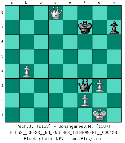 Last move : 0-1 2025 September 6 9:53:54 [Event "FICGS__CHESS__NO_ENGINES_TOURNAMENT__000133"] [Site "FICGS"] [Date "2024.07.30"] [Round "1"] [White "Pech,Jaroslav"] [Black "Schangareev,Mirzian"] [Result "0-1"] [WhiteElo "2163"] [BlackElo "1987"] 1.d4 e6 2.e4 d5 3.Nc3 dxe4 4.Nxe4 Nd7 5.Nf3 Ngf6 6.Nxf6+ Nxf6 7.c3 c5 8.Ne5 a6 9.Be3 cxd4 10.Bxd4 Qc7 11.Qa4+ Nd7 12.Nf3 Qb8 13.Be2 b5 14.Qc2 e5 15.Be3 Bc5 16.Bxc5 Nxc5 17.O-O O-O 18.b4 Ne6 19.Bd3 g6 20.Rfe1 f6 21.a4 Bd7 22.h4 Kg7 23.Be4 Ra7 24.axb5 Bxb5 25.g3 Rc7 26.h5 Qc8 27.Rac1 Nd4 28.h6+ Kh8 29.Nxd4 exd4 30.c4 Rxc4 31.Qd2 Rc3 32.Red1 Qc7 33.Rxc3 dxc3 34.Qd4 Qe7 35.Rc1 Rd8 36.Qxc3 Kg8 37.Bb1 Qf8 38.Ba2+ Kh8 39.Kg2 Bd3 40.Re1 Bf5 41.Be6 Bd3 42.Bb3 Bf5 43.Be6 Rb8 44.Bxf5 gxf5 45.Re6 Qxh6 46.Rxf6 Qg7 47.Qe5 Rd8 48.Qxf5 Qb7+ 49.Kh2 Qg7 50.Qf4 Re8 51.Rxa6 Rf8 52.Qd2 Qe5 53.Ra5 Qf6 54.Kg1 Rf7 55.Rd5 Qa1+ 56.Kg2 Qf6 57.Rd8+ Kg7 58.Rd6 Qf3+ 59.Kg1 Rf8 60.Qd4+ Kg8 61.Rd8 Rxd8 62.Qxd8+ Kf7 63.Qd7+ Kf8 64.Qxh7 Qd1+ 65.Kh2 Qd5 66.Qh6+ Ke8 67.Qe3+ Kd8 68.Qb6+ Kd7 69.Qc5 Qb3 70.b5 Qf3 71.Qc6+ Qxc6 72.bxc6+ Kxc6 73.g4 Kd5 74.Kg3 Ke5 75.g5 Kf5 76.f4 Kg6 77.Kg4 Kf7 0-1 This chess game has been lost on time (started : 2024.07.30 21:23:2) Follow this game move after move (download)Adequate compensation for a sacrifice is having a sound combination leading to a winning position; adequate compensation for a blunder is having your opponent snatch defeat from the jaws of victory. (Bruce A. Moon) Über die Verhaftung Bobby Fischers: Warum es die Bush-Administration für nötig befindet einen 61 Jahre alten Mann zu hetzten, der für niemanden ausser sich selbste eine Gefahr darstellt ist ein Rätsel. (Nigel Short) Un Peón pasado aumenta su poder a medida de que el número de piezas en el tablero disminuye. (Capablanca) Les pièces de l'échiquier étaient impitoyables. Elles le retenaient, elles l'absorbaient. Il y avait de l'horreur en cela, mais aussi une harmonie unique. Car, qu'y a-t-il dans le monde, à part les échecs ? (V. Nabokov) There is no instance of a country having benefited from prolonged warfare. (Sun Tzu)