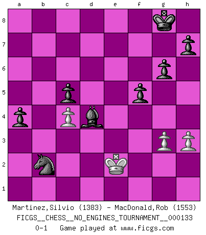 Last move : 0-1 2025 February 25 14:41:8 [Event "FICGS__CHESS__NO_ENGINES_TOURNAMENT__000133"] [Site "FICGS"] [Date "2024.07.30"] [Round "1"] [White "Martinez,Silvio"] [Black "MacDonald,Rob"] [Result "0-1"] [WhiteElo "1383"] [BlackElo "1553"] 1.e4 e6 2.Nf3 d5 3.d4 dxe4 4.Ne5 a6 5.Nc3 Nf6 6.Be2 Bd6 7.Nc4 O-O 8.O-O Nc6 9.d5 exd5 10.Ne3 d4 11.Nxe4 dxe3 12.Bxe3 Nxe4 13.Bf3 Bf5 14.Re1 Qf6 15.Bd4 Nxd4 16.Bxe4 Bxe4 17.Rxe4 Bc5 18.Kh1 Qxf2 19.c3 Ne6 20.b4 Ba7 21.Re2 Qf6 22.c4 Rad8 23.Qf1 Bd4 24.Rd1 Qxf1+ 25.Rxf1 g6 26.h3 Rfe8 27.Rd1 b6 28.R1d2 c5 29.bxc5 bxc5 30.a4 Nf4 31.Rxe8+ Rxe8 32.Kh2 f5 33.g3 Re2+ 34.Rxe2 Nxe2 35.Kg2 Nc3 36.Kf3 Nxa4 37.Kf4 Nb2 38.Kf3 a5 39.Ke2 a4 0-1 This chess game has been lost on time (started : 2024.07.30 21:23:2) Follow this game move after move (download)Different people feel differently about resigning. (Bobby Fischer) Das Zentrum ist der Balkan des Schachbretts - Kriegshandlungen können in jedem Moment ausbrechen. (Aaron Nimzowitsch) Aún el Rey más flojo huye despavorido ante la amenaza de un Jaque doble. (Aaron Nimzowitsch) Il s'avisa de me proposer d'apprendre les échecs qu'il jouait un peu... me voilà forcené des échecs. J'achète un échiquier, je m'enferme dans ma chambre, j'y passe des jours et des nuits à vouloir apprendre par cur toutes les parties. (Jean-Jacques Rousseau, Confessions) The only difference between a tax man and a taxidermist is that the taxidermist leaves the skin. (Mark Twain)