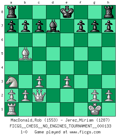 Last move : 1-0 2024 November 17 7:36:12 [Event "FICGS__CHESS__NO_ENGINES_TOURNAMENT__000133"] [Site "FICGS"] [Date "2024.07.30"] [Round "1"] [White "MacDonald,Rob"] [Black "Jerez,Miriam"] [Result "1-0"] [WhiteElo "1553"] [BlackElo "1287"] 1.e4 e5 2.Nf3 Nc6 3.c3 Nf6 4.d4 d5 5.dxe5 Nxe4 6.Bb5 Bd7 7.Qxd5 Nc5 8.O-O Ne6 9.Rd1 Nf4 10.Qe4 Ne6 11.Na3 Nc5 12.Qc2 Qe7 13.Bg5 Qe6 14.Be3 Nxe5 15.Nxe5 Qxe5 16.Bxc5 Bxc5 17.Re1 Be3 18.Rxe3 Qxe3 19.fxe3 1-0 This chess game has been lost on time (started : 2024.07.30 21:23:2) Follow this game move after move (download)Chess is mental torture. (Garry Kasparov) Stelle das Brett so, daß die Sonne in die Augen deines Gegners scheint. (Ruy López) El Ajedrez hace al hombre ser mas sabio y ver mas claro. (Vladimir Putin) D'abord les bases : Jouez et étudiez, puis étudiez et jouez, ensuite jouez et étudiez, puis étudiez et jouez. Deuxièmement : Donnez toujours le meilleur de vous-même ! (Ken Smith) Home computers are being called upon to perform many new functions, including the consumption of homework formerly eaten by the dog. (Doug Larson)