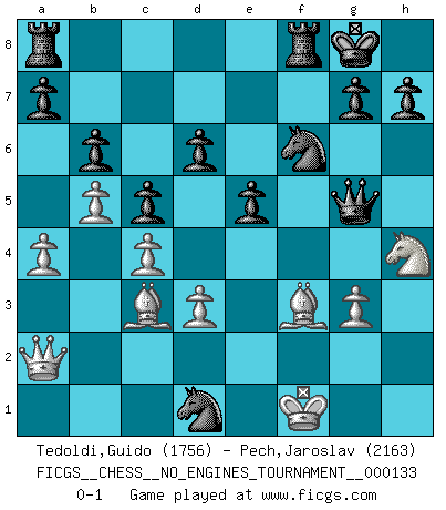 Last move : 0-1 2025 March 16 12:52:26 [Event "FICGS__CHESS__NO_ENGINES_TOURNAMENT__000133"] [Site "FICGS"] [Date "2024.07.30"] [Round "1"] [White "Tedoldi,Guido"] [Black "Pech,Jaroslav"] [Result "0-1"] [WhiteElo "1756"] [BlackElo "2163"] 1.c4 e5 2.Nc3 Nc6 3.d3 f5 4.e3 Bb4 5.Bd2 Nf6 6.a3 Bxc3 7.Bxc3 d6 8.Nf3 O-O 9.Be2 Qe8 10.O-O Ne7 11.h3 Ng6 12.Qc2 Bd7 13.Rad1 b6 14.b4 Ba4 15.Qa2 Bxd1 16.Rxd1 c5 17.b5 f4 18.exf4 Nxf4 19.a4 Qg6 20.Nh4 Qg5 21.g3 Nxh3+ 22.Kf1 Nxf2 23.Bf3 Nxd1 0-1 This chess game has been lost on time (started : 2024.07.30 21:23:2) Follow this game move after move (download)White lost because he failed to remember the right continuation and had to think up the moves himself. (Siegbert Tarrasch) Wenn du nicht weißt was du tun sollst, warte bis dein Gegner eine Idee hat. Sie wird sicher schlecht sein. (Siegbert Tarrasch) El Ajedrez es en su esencia, un juego. En su forma, un arte. Y en su ejecución, una ciencia. (Baron Tassilo) Aux échecs, l'amour-propre est satisfait quand on remporte la victoire, mais il n'y a pas de honte à être battu. (Benjamin Franklin) Without enthusiasm, virtue functions not at all, and vice only poorly. (Mignon McLaughlin, The Neurotic's Notebook, 1960)