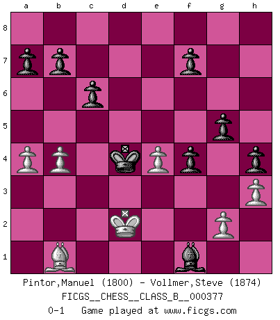 Last move : 0-1 2024 August 21 1:34:2 [Event "FICGS__CHESS__CLASS_B__000377"] [Site "FICGS"] [Date "2024.08.04"] [Round "1"] [White "Pintor,Manuel"] [Black "Vollmer,Steve"] [Result "0-1"] [WhiteElo "1800"] [BlackElo "1874"] 1.e4 Nf6 2.Nc3 d6 3.f4 e5 4.Nf3 Nc6 5.Bc4 exf4 6.O-O Ne5 7.Nxe5 dxe5 8.Kh1 Bg4 9.Qe1 Qd7 10.Nd5 Nxd5 11.Bxd5 c6 12.Bb3 h5 13.c3 g5 14.a4 h4 15.d4 exd4 16.cxd4 Qxd4 17.h3 Be6 18.Bc2 Bb4 19.Qf2 Qxf2 20.Rxf2 Ke7 21.Bd2 Bxd2 22.Rxd2 Rad8 23.Rad1 Rxd2 24.Rxd2 Rd8 25.Rxd8 Kxd8 26.Kg1 Kd7 27.b4 Kd6 28.Kf2 Ke5 29.Ke2 Kd4 30.Kd2 Bc4 31.Bb1 Bf1 0-1 Follow this game move after move (download)If your opponent cannot do anything active, then don't rush the position; instead you should let him sit there, suffer, and beg you for a draw. (Jeremy Silman) Ich habe die besten Aussichten, den ersten Preis zu gewinnen - denn jeder muss gegen Steinitz spielen, nur ich nicht! (Wilhelm Steinitz) Yo tuve un dolor de muelas en la primer partida. En el segundo juego, tuve un dolor de cabeza. En el tercero, tuve un ataque de reumatísmo. En la cuarta partida, no me sentía muy bien. ¿Y en el quinto juego? Bueno, ¿que acaso uno tiene que ganar todos los juegos?. (Siegbert Tarrasch) Les échecs sont utiles à l'exercice de la faculté de penser et à celle de l'imagination. Car nous devons posséder une méthode élaborée pour atteindre des buts partout où nous devons conduire notre raison. (Leibnitz) A specialist learns more and more about less and less until he knows everything about nothing. (Nicholas Murray Butler)
