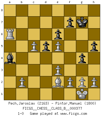 Last move : 1-0 2024 December 15 1:4:55 [Event "FICGS__CHESS__CLASS_B__000377"] [Site "FICGS"] [Date "2024.08.04"] [Round "1"] [White "Pech,Jaroslav"] [Black "Pintor,Manuel"] [Result "1-0"] [WhiteElo "2163"] [BlackElo "1800"] 1.d4 d5 2.c4 c6 3.Nf3 Bf5 4.Nc3 e6 5.Qb3 Qb6 6.c5 Qxb3 7.axb3 Nf6 8.Bf4 Nbd7 9.b4 h6 10.b5 Be7 11.e3 O-O 12.bxc6 bxc6 13.Ba6 Rab8 14.Bxb8 Nxb8 15.O-O Ne4 16.Be2 Nd7 17.Rxa7 Rd8 18.Rfa1 Bf6 19.Ra8 Nb8 20.Nxe4 Bxe4 21.R1a7 g5 22.Rb7 Kg7 23.Raxb8 Rxb8 24.Rxb8 g4 25.Ne5 Bxe5 26.dxe5 h5 27.Rc8 Bc2 28.Rxc6 Ba4 29.Ra6 1-0 Follow this game move after move (download)Bobby is the most misunderstood, misquoted celebrity walking the face of this earth. (Yasser Seirawan) Über Frauen: Chess is better. (Robert James Fischer) Un entendimiento a fondo de las continuaciones típicas del mate, hace de las combinaciones de sacrificio mas complicadas conducirlas a ellas no solo sin dificultad, sino casi de una manera natural. (Siegbert Tarrasch) Avant la finale, les dieux ont créé le milieu de partie. (Tarrasch) Now be brave and don't look back. Don't look back. (Shmi Skywalker in Star Wars ep.1)