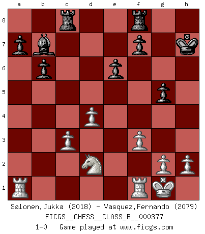 Last move : 1-0 2025 January 2 3:55:19 [Event "FICGS__CHESS__CLASS_B__000377"] [Site "FICGS"] [Date "2024.08.04"] [Round "1"] [White "Salonen,Jukka"] [Black "Vasquez,Fernando"] [Result "1-0"] [WhiteElo "2018"] [BlackElo "2079"] 1.d4 Nf6 2.c4 e6 3.Nc3 Bb4 4.e3 O-O 5.Bd3 c5 6.Nf3 d5 7.O-O dxc4 8.Bxc4 cxd4 9.exd4 b6 10.Qb3 Bxc3 11.bxc3 Bb7 12.Be2 Nc6 13.Bg5 Rc8 14.Rac1 h6 15.Bh4 Na5 16.Qb4 g5 17.Bg3 g4 18.Nd2 Qd5 19.f3 Qxa2 20.Bf4 Nd5 21.Qd6 Nb3 22.Nxb3 Nxf4 23.Qxf4 Qxe2 24.Qxg4+ Kh7 25.Qf4 Qb5 26.Nd2 Qg5 27.Qxg5 hxg5 28.Ra1 1-0 This chess game has been lost on time (started : 2024.08.04 20:51:8) Follow this game move after move (download)Chess is really ninety nine percent calculation. (Soltis) Das typische an einem Großmeister ist, daß er eine gewonnene Position schnell und schmerzlos gewinnt. (Irving Chernev) Aquellos que dicen que entienden al Ajedrez, no entienden nada. (Robert Hubner) La solitude du joueur d'Echecs à l'approche du mat est semblable à celle du condamné. (Francis Szpiner) Knowledge will give you power, but character respect. (Bruce Lee)