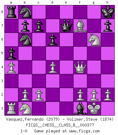 Last move : 1-0 2024 October 26 9:40:29 [Event "FICGS__CHESS__CLASS_B__000377"] [Site "FICGS"] [Date "2024.08.04"] [Round "1"] [White "Vasquez,Fernando"] [Black "Vollmer,Steve"] [Result "1-0"] [WhiteElo "2079"] [BlackElo "1874"] 1.e4 Nf6 2.e5 Nd5 3.d4 d6 4.Nf3 g6 5.Bc4 Nb6 6.Bb3 Bg7 7.O-O O-O 8.a4 a5 9.exd6 exd6 10.Bg5 Bf6 11.Qd2 Bg4 12.Qf4 Bxg5 13.Nxg5 Be2 14.Bxf7+ Kh8 15.Ne6 Qe7 16.Nxf8 Bxf1 17.Nxg6+ 1-0 Follow this game move after move (download)The only thing Chess players have in common is Chess. (Lodewijk Prins) Ich verstehe den Grund nicht, warum die Aufteilung in Frauen und Männer überhaupt im Schach besteht. (Judith Polgar) Bobby es la celebridad menos entendida y malinterpretada que camina el la faz de esta tierra. (Yasser Seirawan) Les Echecs, c'est l'art de la guerre sans les charniers, c'est la résurrection des morts tombés au champ d'honneur, l'espoir perpétuel, la suprématie de l'intelligence sur la force, la culture de l'esprit. (F. Szpiner) The large trees attract high winds. (Chinese proverb)