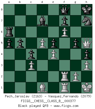 Last move : 1-0 2025 September 25 19:18:30 [Event "FICGS__CHESS__CLASS_B__000377"] [Site "FICGS"] [Date "2024.08.04"] [Round "1"] [White "Pech,Jaroslav"] [Black "Vasquez,Fernando"] [Result "1-0"] [WhiteElo "2163"] [BlackElo "2079"] 1.e4 e5 2.Nf3 Nf6 3.Nc3 Nc6 4.Bb5 Bd6 5.d3 O-O 6.O-O h6 7.a3 Re8 8.h3 Nd4 9.Nxd4 exd4 10.Ne2 c6 11.Ba4 Bc7 12.f4 a5 13.c4 dxc3 14.bxc3 b5 15.Bc2 d6 16.Ng3 Bb6+ 17.d4 c5 18.Kh1 Bb7 19.d5 c4 20.Bd2 Bc5 21.Qf3 Ra6 22.Rab1 Rb6 23.Rbd1 Ra6 24.Rfe1 Qc7 25.Be3 Bxe3 26.Rxe3 Qc5 27.Re2 g6 28.f5 g5 29.Nh5 Nh7 30.f6 Qc8 31.Rf1 Re5 32.Ng7 Qf8 33.Nf5 Kh8 34.Ne7 Bc8 35.Nc6 Bd7 36.Nxe5 dxe5 37.Qg3 Qd6 38.Ref2 h5 39.Bd1 h4 40.Qf3 Qxa3 41.Qh5 Qf8 42.Bg4 Bxg4 43.hxg4 Qg8 44.Rf5 Qg6 45.Qxg6 fxg6 46.Rxe5 Nxf6 47.Re6 Rxe6 48.dxe6 Nxe4 49.e7 Nd6 50.Rd1 Kg8 51.Rxd6 Kf7 52.Rb6 Kxe7 53.Rxb5 a4 54.Ra5 Kd6 55.Kg1 Kc6 56.Rxa4 Kd5 57.Kf2 Ke4 58.Rxc4+ Kd3 59.Rd4+ Kc2 60.Ke2 Kxc3 61.Re4 Kb3 62.Kd2 Kb2 63.Re3 h3 64.gxh3 Kb1 65.Kc3 Ka2 66.Re1 Ka3 67.Ra1+ 1-0 Follow this game move after move (download)The winner of the game is the player who makes the next-to-last mistake. (Savielly Tartakover) Ich las kürzlich ein Buch von Nietzsche. Er sagte Religion verdumme nur die Menschen. Ich stimme zu. (Robert James Fischer) Nos gusta pensar. (Gary Kasparov) Les Cavaliers se révèlent fort utiles dans les positions fermées. D'habitude, les Fous sont un peu plus forts que les Cavaliers dans les positions ouvertes. Qu'on le veuille ou non, il restera toujours des exceptions ! Train yourself to let go of everything you fear to lose. (Master Yoda in Star Wars ep.3)