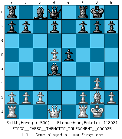 Last move : 1-0 2007 October 16 14:45:49 [Event "FICGS__CHESS__THEMATIC_TOURNAMENT__000035"] [Site "FICGS"] [Date "2007.09.20"] [Round "1"] [White "Smith,Harry"] [Black "Richardson,Patrick"] [Result "1-0"] [WhiteElo "1500"] [BlackElo "1303"] 1.e4 c5 2.Nf3 e6 3.d4 cxd4 4.Nxd4 Bc5 5.g3 Nc6 6.Bg2 Nxd4 7.O-O Ne7 8.Be3 e5 9.Nc3 O-O 10.Nd5 Nxd5 11.Bxd4 Bxd4 12.exd5 1-0 Sicilian defense Kingside Castling by player White (move 7) Kingside Castling by player Black (move 9) Player White won this chess game. Follow this game move after move (download)Avoid the crowd. Do your own thinking independently. Be the Chess player, not the Chess piece. (Ralph Charell) Ein guter Spieler hat immer Glück. (José Raúl Capablanca) El juego de Damas es para vagabundos. (Paul Morphy) D'abord les bases : Jouez et étudiez, puis étudiez et jouez, ensuite jouez et étudiez, puis étudiez et jouez. Deuxièmement : Donnez toujours le meilleur de vous-même ! (Ken Smith) If we knew what we were doing, we would not call it research. (Albert Einstein)