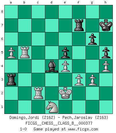 Last move : 1-0 2025 June 16 0:10:40 [Event "FICGS__CHESS__CLASS_B__000377"] [Site "FICGS"] [Date "2024.08.04"] [Round "1"] [White "Domingo,Jordi"] [Black "Pech,Jaroslav"] [Result "1-0"] [WhiteElo "2162"] [BlackElo "2163"] 1.e4 e5 2.Nf3 Nc6 3.Bc4 Nf6 4.d3 Bc5 5.c3 d6 6.Nbd2 a6 7.O-O O-O 8.h3 Ba7 9.a4 h6 10.Re1 Be6 11.Bxe6 fxe6 12.b4 Nh5 13.Nf1 Qe8 14.N1h2 Qg6 15.Ra2 Nf4 16.Bxf4 Rxf4 17.b5 Nb8 18.bxa6 bxa6 19.Qb3 Nd7 20.d4 exd4 21.Qb7 Qe8 22.cxd4 Bb6 23.Qc6 a5 24.g3 Rf7 25.Kg2 e5 26.dxe5 Nxe5 27.Nxe5 dxe5 28.Qxe8+ Rxe8 29.h4 Ref8 30.Ng4 Bd4 31.Ne3 c5 32.Rb1 h5 33.Rb5 c4 34.Rxa5 c3 35.Rb5 Kh7 36.Nd1 Rc8 37.Rc2 Rc4 38.a5 Ra7 39.Kf1 Ra4 40.Ke2 Rf7 41.f3 g6 42.Nxc3 Ra3 43.Nd1 1-0 This chess game has been lost on time (started : 2024.08.04 20:51:8) Follow this game move after move (download)Life is like a game of Chess, changing with each move. (Chinese proverb) Wenn ich Weiß habe gewinne ich weil ich Weiß habe, wenn ich Schwarz habe gewinne ich weil ich Bogoljubov bin. (Efim Bogoljubov) Fischer es una tragedia del Ajedrez Americano a la par con Morphy y Pillsbury. (Mig Greengard) Les échecs sont un jeu terrible. Si vous n'avez pas le centre, votre adversaire a une position plus libre. Par contre, si vous avez le centre, alors vous avez vraiment quelque chose pour laquelle vous inquiéter ! (Siegbert Tarrasch) Drag your thoughts away from your troubles... by the ears, by the heels, or any other way you can manage it. (Mark Twain)