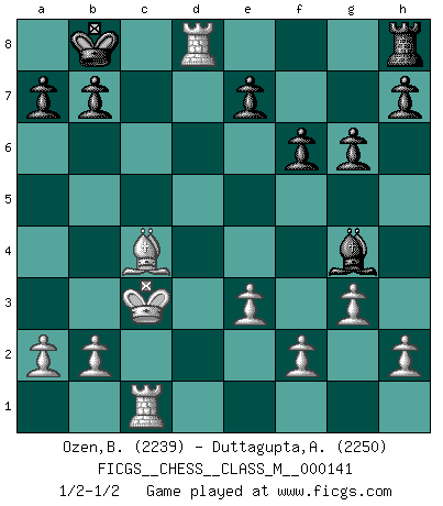 Last move : 1/2-1/2 2024 October 17 9:52:1 [Event "FICGS__CHESS__CLASS_M__000141"] [Site "FICGS"] [Date "2024.08.04"] [Round "1"] [White "Ozen,Bahadir"] [Black "Duttagupta,Aniruddha"] [Result "1/2-1/2"] [WhiteElo "2239"] [BlackElo "2250"] 1.Nf3 Nf6 2.g3 c5 3.Bg2 Nc6 4.c4 d5 5.cxd5 Nxd5 6.d4 cxd4 7.Nxd4 Ndb4 8.Nxc6 Qxd1+ 9.Kxd1 Nxc6 10.Nc3 Bd7 11.Be3 g6 12.Rc1 Bg7 13.Kc2 Nd4+ 14.Bxd4 Bxd4 15.e3 Bxc3 16.Kxc3 O-O-O 17.Rhd1 Kb8 18.Bd5 f6 19.Bc4 Bg4 20.Rxd8+ 1/2-1/2 Follow this game move after move (download)If Chess is a science, it's a most inexact one. If Chess is an art, it is too exacting to be seen as one. If Chess is a sport, it's too esoteric. If Chess is a game, it's too demanding to be just a game. If Chess is a mistress, she's a demanding one. If Chess is a passion, it's a rewarding one. If Chess is life, it's a sad one. (Unknown) Es gibt zwei Arten von Opfern: Korrekte und meine. (Mikhail Nekhemyevich Tal) Todos los jugadores de Ajedrez deberían tener un pasatiempo. (Savielly Tartakower) Une platitude souvent récitée à propos des Echecs est qu'une des choses les plus difficiles à réaliser est de gagner une position gagnante. Cela ne manque pas de sens mais, pour ma part, j'ai toujours trouvé plus difficile de gagner une position perdante. (Tim Krabbe) Luck is when opportunity knocks and you answer. (Anonymous)