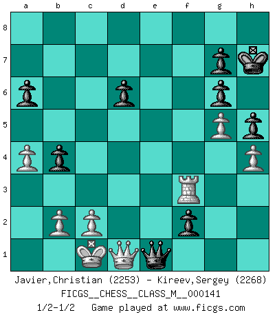 Last move : 1/2-1/2 2024 September 8 13:55:0 [Event "FICGS__CHESS__CLASS_M__000141"] [Site "FICGS"] [Date "2024.08.04"] [Round "1"] [White "Javier,Christian"] [Black "Kireev,Sergey"] [Result "1/2-1/2"] [WhiteElo "2253"] [BlackElo "2268"] 1.e4 c5 2.Nf3 d6 3.d4 cxd4 4.Nxd4 Nf6 5.Nc3 a6 6.h3 e5 7.Nb3 Be7 8.g4 h6 9.Be3 b5 10.Nd5 Bb7 11.Bb6 Qc8 12.Nc7+ Kf8 13.f3 Nbd7 14.Nxa8 Qxa8 15.Bf2 Bxe4 16.Be2 Bg6 17.a4 b4 18.Rh2 Kg8 19.h4 h5 20.g5 Nd5 21.Bd3 Nf4 22.Bxg6 fxg6 23.Be3 Kh7 24.Bxf4 exf4 25.Re2 Re8 26.Nd4 Ne5 27.Qd2 Nxf3+ 28.Nxf3 Qxf3 29.O-O-O Qg4 30.Rde1 f3 31.Rxe7 Rxe7 32.Rxe7 Qg1+ 33.Qd1 f2 34.Rf7 Qe1 35.Rf3 1/2-1/2 Follow this game move after move (download)When your house is on fire, you can't be bothered with the neighbors. Or, as we say in Chess, if your King is under attack you don't worry about losing a Pawn on the Queen's side. (Gary Kasparov) Schach ist das Spiel, das die Verrückten gesund hält. (Albert Einstein) Las Aperturas te enseñan aperturas. ¡Los Finales te enseñan Ajedrez!. (Stephan Gerzadowicz) Pour moi, les échecs ne sont pas un jeu mais un art. (Alexandre Alekhine) Wisdom doesn't necessarily come with age. Sometimes age just shows up all by itself. (Tom Wilson)