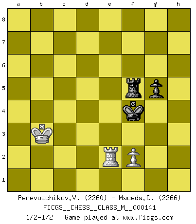 Last move : 1/2-1/2 2024 October 31 23:13:15 [Event "FICGS__CHESS__CLASS_M__000141"] [Site "FICGS"] [Date "2024.08.04"] [Round "1"] [White "Perevozchikov,Vjacheslav"] [Black "Maceda,Coco"] [Result "1/2-1/2"] [WhiteElo "2260"] [BlackElo "2266"] 1.Nf3 Nf6 2.d4 g6 3.c4 Bg7 4.Nc3 d5 5.h4 O-O 6.cxd5 Nxd5 7.h5 c5 8.hxg6 hxg6 9.Bh6 Bxh6 10.Rxh6 Nxc3 11.bxc3 cxd4 12.Qd2 Kg7 13.cxd4 Nd7 14.Ng5 Nf6 15.e4 e5 16.Rh4 Qxd4 17.Qxd4 exd4 18.Kd2 Nh5 19.Bc4 f6 20.Nf3 Bd7 21.Nxd4 Rad8 22.Rb1 b6 23.Rc1 Rc8 24.Bb3 Rxc1 25.Kxc1 Rd8 26.Kc2 b5 27.g3 b4 28.Rh1 a5 29.Rd1 Rc8+ 30.Kd3 f5 31.e5 f4 32.gxf4 a4 33.Bd5 Nxf4+ 34.Ke4 g5 35.e6 Be8 36.Ke5 Ng6+ 37.Kd6 Kf6 38.Bb7 Rc4 39.Bc6 Bxc6 40.Nxc6 Re4 41.Rd2 b3 42.axb3 axb3 43.Rb2 Rxe6+ 44.Kc5 Ne5 45.Nxe5 Rxe5+ 46.Kc4 Rf5 47.Kxb3 Ke5 48.Re2+ Kf4 1/2-1/2 Follow this game move after move (download)Morphy was probably the greatest genius of them all. (Bobby Fischer) Im Schach nämlich geht es darum, daß Ich des Gegners klein zu kriegen, sein Ego zu zerbrechen und zu zermahlen, seine Selbstachtung zu zertreten und zu verscharren und seine ganze mißachtenswerte sogenannte Persönlichkeit ein für alle Mal tot zu hacken und zu zerstampfen und dadurch die menschliche Gesellschaft von einer stinkenden Pestbeule zu befreien. Es ist ein königliches Spiel. (Robert James Fischer) ¿Se han dado cuenta de que Fischer casi nunca ha tenido piezas malas? El las intercambia y las piezas malas se quedan con sus oponenets. (Yuri Balashov) Le jeu d'échecs fait naître et fortifie en nous plusieurs qualités précieuses dans le cours de l'existence, telles que la prévoyance, la circonspection, la prudence, et la persévérance. (Benjamin Franklin - 1783, la morale des échecs) I can't decide which is riskier; taking crazy risks, or taking advice on crazy risks from a crazy risk taker. (Gregory House in House M.D.)