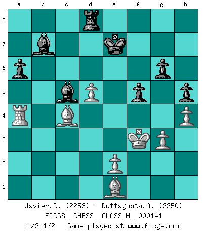 Last move : 1/2-1/2 2024 November 22 0:28:39 [Event "FICGS__CHESS__CLASS_M__000141"] [Site "FICGS"] [Date "2024.08.04"] [Round "1"] [White "Javier,Christian"] [Black "Duttagupta,Aniruddha"] [Result "1/2-1/2"] [WhiteElo "2253"] [BlackElo "2250"] 1.Nf3 Nf6 2.c4 c5 3.Nc3 Nc6 4.g3 d5 5.d4 e6 6.cxd5 Nxd5 7.Bg2 cxd4 8.Nxd4 Nxc3 9.bxc3 Nxd4 10.Qxd4 Qxd4 11.cxd4 Bd6 12.O-O O-O 13.a4 Rb8 14.Be3 b6 15.a5 Rd8 16.Rfc1 Bb7 17.h4 h5 18.Ra2 Rdc8 19.Rxc8+ Bxc8 20.d5 e5 21.Be4 Kf8 22.Bd3 Bb7 23.Bc4 bxa5 24.Rxa5 a6 25.Bd2 e4 26.Kg2 Ra8 27.Be1 Ke7 28.Ra4 Rd8 29.Bb3 f5 30.Bc4 g6 31.f3 exf3+ 32.Kxf3 Bc5 1/2-1/2 Follow this game move after move (download)Mistrust is the most necessary characteristic of the Chess player. (Siegbert Tarrasch) Es ist schade, dass viele Schachsportler vergessen, wie wichtig Auftreten und angemessene Kleidung sind. (Alexandra Kosteniuk) El Ajedrez es tan inspirador que yo no creo que un buen jugador sea capaz de tener un pensamiento malo durante una partida. (Wilhelm Steinitz) A ce moment-là, je menaçais de comprendre la position ! (Clément L'Heureux) Be who you are, and say what you feel because those who mind don't matter, and those who matter don't mind. (Dr Seuss)