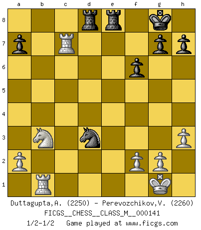 Last move : 1/2-1/2 2024 November 10 11:3:21 [Event "FICGS__CHESS__CLASS_M__000141"] [Site "FICGS"] [Date "2024.08.04"] [Round "1"] [White "Duttagupta,Aniruddha"] [Black "Perevozchikov,Vjacheslav"] [Result "1/2-1/2"] [WhiteElo "2250"] [BlackElo "2260"] 1.Nf3 e6 2.c4 Nf6 3.Nc3 d5 4.d4 dxc4 5.e4 b5 6.Nxb5 Nxe4 7.Qa4 c6 8.Nc3 Nxc3 9.bxc3 Ba6 10.Bxc4 Bxc4 11.Qxc4 Bd6 12.O-O O-O 13.Rd1 Qc7 14.Qd3 Nd7 15.c4 c5 16.h3 Rfd8 17.Bg5 f6 18.Be3 cxd4 19.Nxd4 Ne5 20.Qb3 Qxc4 21.Nxe6 Rd7 22.Rd5 Re8 23.Nd4 Qxb3 24.Nxb3 Nc4 25.Rad1 R7d8 26.Bc5 Nb2 27.Rb1 Bxc5 28.Rxc5 Nd3 29.Rc7 1/2-1/2 Follow this game move after move (download)Bobby is the finest Chess player this country ever produced. His memory for the moves, his brilliance in dreaming up combinations, and his fierce determination to win are uncanny. (John Collins) Die westlichen Werte sind eine Sprache, welche die Putin-Administration nicht versteht. (Garry Kasparov) Yo jugué Ajedrez con el y a veces le pude haber ganado solo que siempre devuelve su última jugada y juega la partida de manera diferente. (Mark Twain) Mais n'est-ce pas déjà le limiter injurieusement que d'appeler les échecs un jeu? N'est-ce pas aussi une science, un art, ou quelque chose qui, comme le cercueil de Mahomet entre ciel et terre, est suspendu entre l'un et l'autre, et qui réunit un nombre incroyable de contraires ? (Stefan Zweig) Memory is a complicated thing, a relative to truth, but not its twin. (Barbara Kingsolver, Animal Dreams)