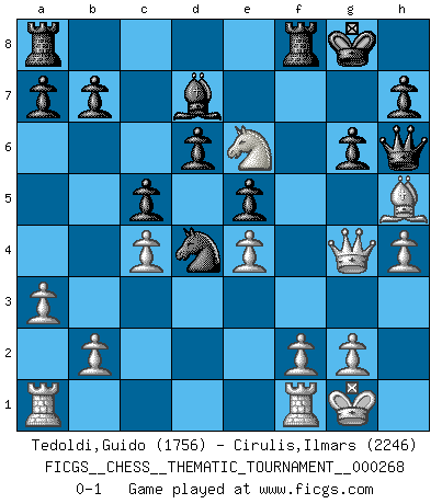 Last move : 0-1 2024 December 11 9:31:15 [Event "FICGS__CHESS__THEMATIC_TOURNAMENT__000268"] [Site "FICGS"] [Date "2024.08.09"] [Round "1"] [White "Tedoldi,Guido"] [Black "Cirulis,Ilmars"] [Result "0-1"] [WhiteElo "1756"] [BlackElo "2246"] 1.e4 e5 2.Nf3 d6 3.c4 c5 4.Nc3 f5 5.exf5 Bxf5 6.d3 Nf6 7.Bg5 Be7 8.h3 O-O 9.Be2 Nc6 10.O-O Qe8 11.a3 Bd7 12.Ne4 Nxe4 13.dxe4 Bxg5 14.Nxg5 Qg6 15.h4 Nd4 16.Bh5 Qf6 17.Qd3 Qh6 18.Qd1 Ba4 19.Qg4 g6 20.Ne6 Bd7 0-1 Follow this game move after move (download)Fischer is completely natural. He plays no roles. He's like a child. Very, very simple. (Zita Rajcsanyi) Heutzutage gewinnt im Turnier nicht derjenige Spieler, der weitreichende Pläne entwirft, sondern einfach jener, der Zug um Zug kämpft. (David Bronstein) Yo no le temo a Spassky. Todos saben que yo soy el mejor. Uno no necesita un torneo para probarlo. (Bobby Fischer) Les échecs, c'est l'art d'analyser. (Mikhail Botvinnik) Life is like a play: it's not the length but the excellence of the acting that matters. (Seneca)