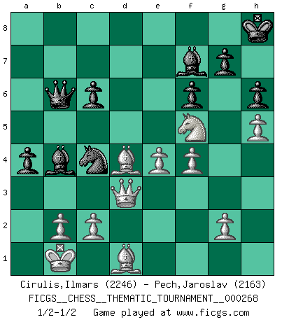 Last move : 1/2-1/2 2025 January 6 2:38:34 [Event "FICGS__CHESS__THEMATIC_TOURNAMENT__000268"] [Site "FICGS"] [Date "2024.08.09"] [Round "1"] [White "Cirulis,Ilmars"] [Black "Pech,Jaroslav"] [Result "1/2-1/2"] [WhiteElo "2246"] [BlackElo "2163"] 1.e4 e5 2.Nf3 d6 3.d4 exd4 4.Nxd4 Nf6 5.Nc3 Be7 6.Bf4 O-O 7.Qd2 Nc6 8.O-O-O Nxd4 9.Qxd4 Be6 10.f3 Nd7 11.h4 Re8 12.Qd2 Ne5 13.Qe1 f6 14.Kb1 c6 15.Ne2 Bf7 16.Nd4 Bf8 17.Nf5 a5 18.h5 a4 19.Qg3 Kh8 20.Rxd6 Qc7 21.a3 h6 22.Be2 b5 23.Rhd1 Rad8 24.R6d2 Rxd2 25.Bxd2 Rd8 26.f4 Nc4 27.Bc3 Rxd1+ 28.Bxd1 Qb6 29.Qd3 b4 30.axb4 Bxb4 31.Bd4 1/2-1/2 Follow this game move after move (download)The sign of a great Master is his ability to win a won game quickly and painlessly. (Irving Chernev) Der 70jährige Viktor Kortschnoi: Die Rentenanstalt wollte mich zwingen in Rente zu gehen. Meine Frau erhält jetzt eine Pension- und ich zahle weiter in die Rentenkasse ein! (Viktor Kortschnoi) En un gambito tu regalas un Peón por el bién de tomar un juego perdido. (Samuel Standige Boden) Il n'y a pas de prix trop élevé au scalp de l'ennemi. (Koblentz) Wikichess, chess moves explained by 'experimented' players. (Thibault de Vassal)