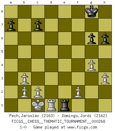 Last move : 1-0 2025 February 14 16:39:3 [Event "FICGS__CHESS__THEMATIC_TOURNAMENT__000268"] [Site "FICGS"] [Date "2024.08.09"] [Round "1"] [White "Pech,Jaroslav"] [Black "Domingo,Jordi"] [Result "1-0"] [WhiteElo "2163"] [BlackElo "2162"] 1.e4 e5 2.Nf3 d6 3.d4 f5 4.Bc4 Nc6 5.Ng5 Nh6 6.d5 Ne7 7.Nc3 g6 8.exf5 Nhxf5 9.g4 h6 10.Nf3 Ng7 11.h3 Kf7 12.Bd2 Ne8 13.Nxe5+ dxe5 14.d6 Kg7 15.dxe7 Bxe7 16.Qe2 Nd6 17.O-O-O Bd7 18.Qxe5+ Bf6 19.Qc5 Re8 20.Rhe1 Rxe1 21.Bxe1 Nxc4 22.Qxc4 Qe7 23.Nd5 Be6 24.Bc3 Bxd5 25.Rxd5 Bxc3 26.Qxc3+ Kg8 27.Qb3 Qf7 28.Qxb7 Re8 29.Qb3 Re1+ 30.Rd1 Qxb3 31.axb3 1-0 Follow this game move after move (download)You are for me the Queen on d8 and I am the Pawn on d7 !! (Eduard Gufeld) Schach ist die gewalttätigste aller Sportarten. (Garry Kasparov) La estratégia requiere pensar, la táctica requiere observación. (Max Euwe) Un millionnaire : 'Monsieur Steinitz ! Vous ne participez aux tournois que pour l'argent, alors que moi je n'y viens que pour l'honneur.' Steinitz : 'Chacun joue pour ce qu'il n'a pas'... Everything in life is luck. (Donald Trump)