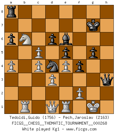 Last move : 1-0 2025 June 16 0:9:47 [Event "FICGS__CHESS__THEMATIC_TOURNAMENT__000268"] [Site "FICGS"] [Date "2024.08.09"] [Round "1"] [White "Tedoldi,Guido"] [Black "Pech,Jaroslav"] [Result "1-0"] [WhiteElo "1756"] [BlackElo "2163"] 1.e4 e5 2.Nf3 d6 3.c4 c5 4.Nc3 Nc6 5.h3 g6 6.d3 Bg7 7.Be2 Nge7 8.O-O O-O 9.Bg5 f6 10.Bh4 h5 11.Re1 Bh6 12.a3 b6 13.Nd2 Nd4 14.Nb5 Nxe2+ 15.Rxe2 a6 16.Nc3 Nc6 17.Nd5 Nd4 18.Re1 Bxd2 19.Qxd2 g5 20.Bg3 h4 21.Bh2 Bxh3 22.Qd1 Be6 23.Rb1 f5 24.a4 f4 25.Qh5 Kg7 26.b4 h3 27.Nxb6 hxg2 28.bxc5 Rh8 29.Qd1 Rxh2 30.Kxh2 Qh8+ 31.Kxg2 Qh3+ 32.Kg1 1-0 This chess game has been lost on time (started : 2024.08.09 20:59:7) Follow this game move after move (download)Live, lose, and learn, by observing your opponent how to win. (Amber Steenbock) Es hat in meinem Leben Zeiten gegeben, da ich sehr nahe daran war zu glauben, daß ich auch nicht eine einzige Schachpartie verlieren könnte. (José Raúl Capablanca) En posiciones complicadas, Bobby Fischer pocas veces tuvo que temer de cualquiera. (Paul Keres) Le joueur d'Echecs qui veut atteindre le top est obligé de développer son propre credo créatif. Alexeï Stepanovicth Souétine. Il est facile d'écrire des livres ! Ce qui est difficile, c'est de jouer ! (Alexeï Stepanovicth Souétine) In fact if nothing is done against this teddy bear, hereby I announce that I would quit chess, rapid chess, blitz chess, postal chess, email chess, server chess and correspondence chess I will then switch to a table game where teddy bears aren't going to be seen for a while, like Poker, or Roulette, all 18+ games. (Elmer Valderrama)