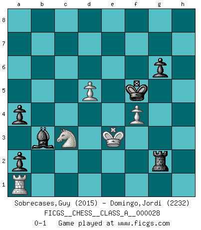 Last move : 0-1 2008 August 22 7:3:5 [Event "FICGS__CHESS__CLASS_A__000028"] [Site "FICGS"] [Date "2007.09.20"] [Round "1"] [White "Sobrecases,Guy"] [Black "Domingo,Jordi"] [Result "0-1"] [WhiteElo "2015"] [BlackElo "2232"] 1.e4 e5 2.Nf3 f5 3.Bc4 fxe4 4.Nxe5 d5 5.Qh5+ g6 6.Nxg6 hxg6 7.Qxh8 Kf7 8.Qd4 Be6 9.Bb3 Nc6 10.Qe3 Bh6 11.Qg3 Nf6 12.f3 exf3 13.O-O Nd4 14.Nc3 b5 15.Qh4 Ng4 16.Qxd8 Rxd8 17.gxf3 Ne5 18.d3 Bxc1 19.Raxc1 c5 20.Rce1 Kf6 21.Kg2 c4 22.dxc4 dxc4 23.Ne4+ Kf5 24.c3 cxb3 25.cxd4 Nd3 26.Rd1 Nf4+ 27.Kf2 bxa2 28.h4 Bb3 29.Rc1 Nd3+ 30.Ke3 Nxc1 31.Rxc1 a5 32.Rg1 Bf7 33.b3 Bd5 34.Rg5+ Ke6 35.Rg1 Kf7 36.Nc3 Re8+ 37.Kd3 Bxb3 38.Nxb5 Rh8 39.Nc3 Rxh4 40.Ra1 Rh2 41.d5 Kf6 42.Kd4 Kf5 43.Ke3 Ke5 44.f4+ Kf5 45.Rg1 Rg2 46.Ra1 a4 0-1 This chess game has been lost on time (started : 2007.09.20 15:28:39) Latvian : Polerio variation Kingside Castling by player White (move 13) Player Black won this chess game. Follow this game move after move (download)You sit at the board and suddenly your heart leaps. Your hand trembles to pick up the piece and move it. But what Chess teaches you is that you must sit there calmly and think about whether it's really a good idea and whether there are other better ideas. (Stanley Kubrick) Moralische Siege zählen nicht. (Savielly Grigorievitsch Tartakower) No hay precio que sea tan grande por la cabellera del Rey enemigo. (Koblentz) Le génie consiste à savoir transgresser les règles au moment opportun. (Teichmann) There is no vagueness without wind. (Chinese proverb)