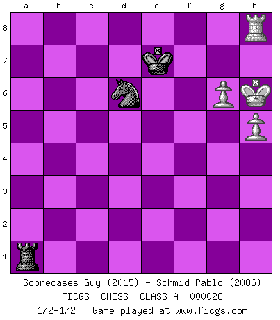 Last move : 1/2-1/2 2008 July 1 22:55:37 [Event "FICGS__CHESS__CLASS_A__000028"] [Site "FICGS"] [Date "2007.09.20"] [Round "1"] [White "Sobrecases,Guy"] [Black "Schmid,Pablo"] [Result "1/2-1/2"] [WhiteElo "2015"] [BlackElo "2006"] 1.e4 e5 2.Nf3 Nc6 3.Bb5 f5 4.Nc3 fxe4 5.Nxe4 d5 6.Nxe5 dxe4 7.Nxc6 Qg5 8.Qe2 Nf6 9.Nxa7 Bd7 10.Bxd7+ Nxd7 11.f4 Qc5 12.Nb5 Qxc2 13.d3 Bb4+ 14.Kf1 Qxe2+ 15.Kxe2 exd3+ 16.Kxd3 O-O-O 17.Kc4 Bc5 18.Re1 Rhe8 19.Rxe8 Rxe8 20.Bd2 Re2 21.Re1 Nb6+ 22.Kxc5 Rxd2 23.Re7 Rc2+ 24.Kd4 Rxb2 25.Rxc7+ Kd8 26.Rxg7 Rxb5 27.Rxb7 Rb2 28.g4 h6 29.Ke4 Kc8 30.Rh7 Rb4+ 31.Kf5 Nd5 32.Rxh6 Nxf4 33.g5 Nd5 34.a3 Rb3 35.Rh7 Rxa3 36.h4 Ne3+ 37.Ke4 Ng4 38.g6 Nf6+ 39.Kf4 Kd8 40.h5 Ra1 41.Kg5 Ne8 42.Kh6 Nd6 43.Rh8+ Ke7 1/2-1/2 Ruy Lopez : Schliemann defense, Berger variation Queenside Castling by player Black (move 16) 10 pieces endgame at move 27 : White KRPPPP , Black KRNP WHITE : King + 1 Rook 4 Pawns BLACK : King + 1 Rook 1 Knight 1 Pawn 9 pieces endgame at move 32 : White KRPPPP , Black KRN WHITE : King + 1 Rook 4 Pawns BLACK : King + 1 Rook 1 Knight 8 pieces endgame at move 32 : White KRPPP , Black KRN WHITE : King + 1 Rook 3 Pawns BLACK : King + 1 Rook 1 Knight 7 pieces endgame at move 35 : White KRPP , Black KRN WHITE : King + 1 Rook 2 Pawns BLACK : King + 1 Rook 1 Knight This chess game ended in a draw. Follow this game move after move (download)Chess is a sea in which a gnat may drink and an elephant may bathe. (Hindu proverb) Über Frauen: Chess is better. (Robert James Fischer) El Rey es una pieza de pelea. ¡Usenlo!. (Wilhelm Steinitz) Il (Jacob Murray) ne joue pas pour le bon coup, mais pour le meilleur. (Eloi Relange) Locking firmely the window serves nothing, only small thiefs pass through there, the big thiefs enter through the front door. (Luc-Olivier Leclerc)