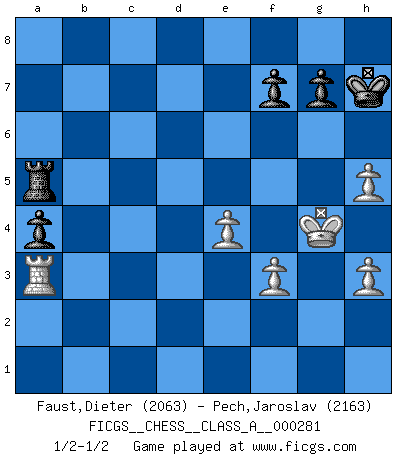 Last move : 1/2-1/2 2025 June 10 1:37:46 [Event "FICGS__CHESS__CLASS_A__000281"] [Site "FICGS"] [Date "2024.08.14"] [Round "1"] [White "Faust,Dieter"] [Black "Pech,Jaroslav"] [Result "1/2-1/2"] [WhiteElo "2063"] [BlackElo "2163"] 1.d4 d5 2.c4 e6 3.Nf3 Nf6 4.g3 Be7 5.Bg2 O-O 6.O-O dxc4 7.Qc2 a6 8.a4 Bd7 9.Qxc4 Bc6 10.Bg5 Nbd7 11.Nc3 h6 12.Bxf6 Nxf6 13.Rfd1 a5 14.Ne5 Bxg2 15.Kxg2 c6 16.Rac1 Qb6 17.e3 Rfd8 18.h3 Rac8 19.Qe2 Nd7 20.Nc4 Qa6 21.e4 Bf8 22.b3 b5 23.Ne3 Qa8 24.Qf3 Rb8 25.Ng4 Ba3 26.Rc2 bxa4 27.Nxa4 Rb5 28.Rc3 Qb7 29.R1d3 Bb4 30.Rc2 h5 31.Nh2 Be7 32.Qe3 h4 33.gxh4 Nf8 34.Nf3 Ng6 35.Nc3 Rxb3 36.h5 Nf8 37.Nd5 Rxd3 38.Nxe7+ Qxe7 39.Qxd3 e5 40.Qe3 exd4 41.Nxd4 Qa7 42.Nf5 Qxe3 43.Nxe3 Ra8 44.Rxc6 a4 45.Rc2 Ne6 46.Ra2 Ra7 47.Nc4 Nd4 48.f3 Nb5 49.Na3 Nxa3 50.Rxa3 Ra5 51.Kg3 Kh7 52.Kg4 1/2-1/2 Follow this game move after move (download)Bobby Fischer is the greatest Chess genius of all time ! (Alexander Kotov) Schach ist die gewalttätigste aller Sportarten. (Garry Kasparov) El Ajedrez moderno está demasiado preocupado con cosas como la estructura de Peones. Olvidenlo, el Jaque Mate termina la partida. (Nigel Short) Le profane ne songe pas à la somme de jouissance dont il se prive, qui méconnaît ce jeu aux ressources aussi variées que passionnantes. (Jean-Marie Jeanton-Lamarche) I'll be back. (Arnold Schwarzenegger)