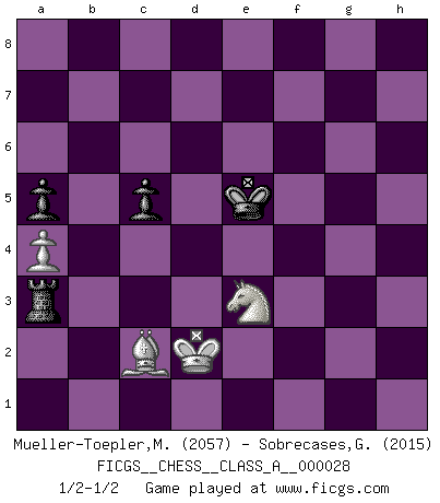 Last move : 1/2-1/2 2008 May 4 21:34:13 [Event "FICGS__CHESS__CLASS_A__000028"] [Site "FICGS"] [Date "2007.09.20"] [Round "1"] [White "Mueller-Toepler,Michael"] [Black "Sobrecases,Guy"] [Result "1/2-1/2"] [WhiteElo "2057"] [BlackElo "2015"] 1.c4 Nc6 2.d4 d5 3.cxd5 Qxd5 4.e3 e5 5.Nc3 Bb4 6.Bd2 Bxc3 7.Bxc3 exd4 8.Ne2 Bg4 9.f3 Bxf3 10.gxf3 Qxf3 11.Nxd4 Qxh1 12.Nxc6 Nf6 13.Na5 Qe4 14.Qe2 Qh4+ 15.Qf2 Qxf2+ 16.Kxf2 Ne4+ 17.Kf3 Nxc3 18.bxc3 Rd8 19.Nxb7 Rd2 20.Bc4 Ke7 21.Nc5 Rhd8 22.Rg1 g6 23.Rg4 f5 24.Rh4 h5 25.e4 Rc2 26.Na4 R8d2 27.exf5 gxf5 28.Rxh5 Rxh2 29.Rxh2 Rxh2 30.Kg3 Rh1 31.Bb3 Rc1 32.Kf4 Kf6 33.c4 Rf1+ 34.Ke3 Ke5 35.Nc5 Re1+ 36.Kf2 Rb1 37.Na6 c6 38.Ke3 Re1+ 39.Kd2 Rh1 40.Nb4 c5 41.Nd3+ Kd4 42.Ke2 Rh2+ 43.Nf2 Rh7 44.Kf3 Re7 45.Nd1 Re1 46.Kf2 Re4 47.Kf3 a5 48.Kf2 Rh4 49.Kg3 Rg4+ 50.Kf3 Rg7 51.Ne3 Ke5 52.Bc2 Rg1 53.Nxf5 Rf1+ 54.Ke2 Ra1 55.a4 Ra2 56.Ne3 Kd4 57.Kd2 Ra3 58.Nf5+ Kxc4 59.Ne3+ Kd4 60.Nf5+ Kd5 61.Ne3+ Kd4 62.Nf5+ Ke5 63.Ne3 1/2-1/2 English Opening 10 pieces endgame at move 29 : White KBNPP , Black KRPPP WHITE : King + 1 Bishop 1 Knight 2 Pawns BLACK : King + 1 Rook 3 Pawns 9 pieces endgame at move 53 : White KBNPP , Black KRPP WHITE : King + 1 Bishop 1 Knight 2 Pawns BLACK : King + 1 Rook 2 Pawns 8 pieces endgame at move 58 : White KBNP , Black KRPP WHITE : King + 1 Bishop 1 Knight 1 Pawn BLACK : King + 1 Rook 2 Pawns This chess game ended in a draw. Follow this game move after move (download)Chess makes man wiser and clear-sighted. (Vladimir Putin) Bobby Fischer ist kein Vorbild für die heutige Jugend. (Viktor Kortschnoi) El Ajedrez demanda una total concentración. (Bobby Fischer) Si rien de grave n'est détecté lors de l'analyse d'une position, on joue alors le coup. Seconde règle de Blumenfeld. However beautiful the strategy, you should occasionally look at the results. (Winston Churchill)