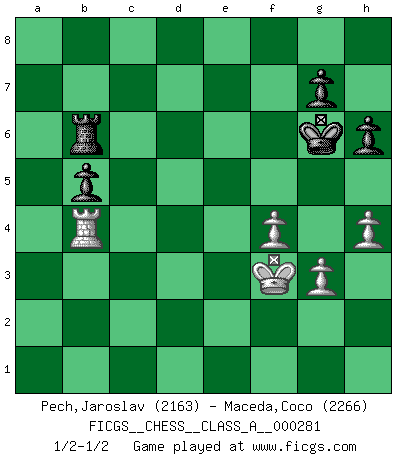 Last move : 1/2-1/2 2025 July 8 19:56:3 [Event "FICGS__CHESS__CLASS_A__000281"] [Site "FICGS"] [Date "2024.08.14"] [Round "1"] [White "Pech,Jaroslav"] [Black "Maceda,Coco"] [Result "1/2-1/2"] [WhiteElo "2163"] [BlackElo "2266"] 1.c4 e5 2.Nc3 Nf6 3.Nf3 Nc6 4.g3 d5 5.cxd5 Nxd5 6.Bg2 Nb6 7.O-O Be7 8.a3 O-O 9.d3 Be6 10.Be3 f5 11.Rc1 a6 12.Na4 Bd5 13.Bc5 Nxa4 14.Qxa4 Bxc5 15.Rxc5 Qd6 16.Rfc1 Kh8 17.Ng5 Bxg2 18.Kxg2 Rae8 19.Qc4 Qf6 20.h4 h6 21.Rh1 Re7 22.b4 Nd4 23.e3 Nb5 24.a4 Nd6 25.Qc2 f4 26.d4 f3+ 27.Kg1 Qf5 28.Qxf5 Nxf5 29.Nxf3 exd4 30.Nxd4 Nxd4 31.exd4 Re2 32.Rh2 c6 33.d5 cxd5 34.Rxd5 Re4 35.a5 Rxb4 36.f4 Rb1+ 37.Kg2 Rb5 38.Rxb5 axb5 39.Rh1 Ra8 40.Rd1 b6 41.axb6 Rb8 42.Rb1 Rxb6 43.Rb4 Kh7 44.Kf3 Kg6 45.Ke4 Kh5 46.Kf3 Kg6 47.Ke4 Kh5 48.Kf3 Kg6 1/2-1/2 Follow this game move after move (download)When you don't know what to do, wait for your opponent to get an idea - it's sure to be wrong. (Tarrasch) Es ist peinlich, dass ich nie Weltmeister wurde. Es wäre leicht, Leonid Breschnjew als Ursache vorzuschieben, dessen Apparat den Vorzeigekommunisten Anatoli Karpow in allem unterstützte. Aber Garri Kasparow zum Beispiel, der ebenfalls von den Sowjets unerwünscht war, hat trotz der Widerstände den WM-Titel erobert. (Viktor Kortschnoi) Si el ingenio solamente fuese necesario para lucirse, las mujeres serían las mejores jugadoras de Ajedrez del mundo. (Albin) Fischer est le meilleur joueur du monde et Karpov n'est qu'un joueur de bistrot. (Garry Kasparov, agé de 16 ans) The only thing that overcomes hard luck is hard work. (Harry Golden)