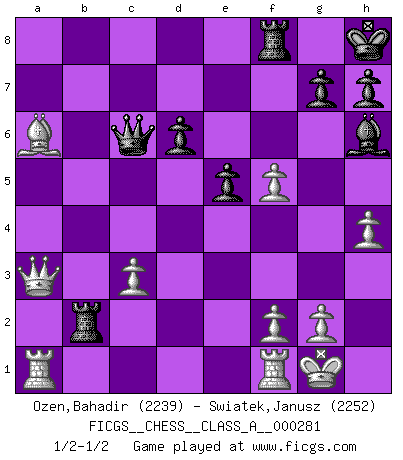 Last move : 1/2-1/2 2024 September 28 21:32:21 [Event "FICGS__CHESS__CLASS_A__000281"] [Site "FICGS"] [Date "2024.08.14"] [Round "1"] [White "Ozen,Bahadir"] [Black "Swiatek,Janusz"] [Result "1/2-1/2"] [WhiteElo "2239"] [BlackElo "2252"] 1.e4 c5 2.Nf3 Nc6 3.d4 cxd4 4.Nxd4 Nf6 5.Nc3 e5 6.Ndb5 d6 7.Bg5 a6 8.Na3 b5 9.Nd5 Be7 10.Bxf6 Bxf6 11.c3 Bg5 12.Nc2 Ne7 13.h4 Bh6 14.a4 bxa4 15.Ncb4 O-O 16.Qxa4 Nxd5 17.Nxd5 Kh8 18.Qa5 Qd7 19.Be2 Rb8 20.O-O f5 21.Nb6 Qd8 22.Nxc8 Qxc8 23.Bxa6 Qc6 24.exf5 Rxb2 25.Qa3 1/2-1/2 Follow this game move after move (download)The chessboard is the world, the pieces are the phenomena of the Universe, the rules of the game are what we call the laws of Nature and the player on the other side is hidden from us. (Thomas Huxley) Modernes Schach sorgt sich zuviel um Dinge wie Bauernstruktur usw. Vergessen Sie das, Schachmatt beendet das Spiel! (Nigel Short) La captura del Rey enemigo es la finalidad pero no el primer objetivo de la partida. (William Steinitz) Le jeu d'échecs est comme rejeté hors du temps. (Antoine de Saint-Exupéry) For to win one hundred victories in one hundred battles is not the acme of skill. To subdue the enemy without fighting is the acme of skill. (Sun Tzu)