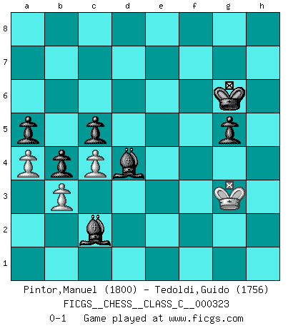 Last move : 0-1 2025 February 14 19:25:50 [Event "FICGS__CHESS__CLASS_C__000323"] [Site "FICGS"] [Date "2024.08.24"] [Round "1"] [White "Pintor,Manuel"] [Black "Tedoldi,Guido"] [Result "0-1"] [WhiteElo "1800"] [BlackElo "1756"] 1.e4 c5 2.f4 d6 3.Bc4 Nc6 4.Nf3 e6 5.O-O Nf6 6.Nc3 h6 7.d3 g6 8.h3 Bg7 9.Ne2 O-O 10.c3 Na5 11.Bb5 a6 12.Ba4 b5 13.Bc2 Nc6 14.Ng3 a5 15.a4 b4 16.c4 Rb8 17.e5 dxe5 18.Rb1 Rb7 19.b3 exf4 20.Bxf4 Re8 21.Ne5 Qd4+ 22.Kh2 Nxe5 23.Qe2 Nc6 24.Ne4 Nxe4 25.Qxe4 Qxe4 26.dxe4 e5 27.Be3 Nd4 28.Bd1 f5 29.exf5 Bxf5 30.Rc1 Rf7 31.g4 Be6 32.Rxf7 Bxf7 33.Kg3 g5 34.h4 gxh4+ 35.Kxh4 e4 36.Bxd4 Bxd4 37.Be2 e3 38.Rf1 Kg7 39.g5 Re4+ 40.Kg3 hxg5 41.Bd3 e2 42.Bxe2 Rxe2 43.Kg4 Kg6 44.Rf3 Be6+ 45.Kg3 Re3 46.Kg2 Rxf3 47.Kxf3 Bf5 48.Kg3 Bc2 0-1 Follow this game move after move (download)Becoming successful at Chess allows you to discover your own personality. That's what I want for the kids I teach. (Saudin Robovic) Ein Isolani verdüstert die Stimmung auf dem ganzen Schachbrett. (Savielly Grigorievitsch Tartakower) No hay un Gran Maestro de Ajedrez que sea normal; solo se diferencían ellos por la magnitud de su locura. (Viktor Korchnoi) Dans le domaine de la peinture, de la gravure et de la sculpture, dès la première décennie de notre siècle, les artistes abandonnent la représentation de la partie d'échecs pour se concentrer sur les pièces, sur les échiquiers et sur toutes les variations auxquelles les unes et les autres peuvent donner lieu. On passe en quelque sorte d'un thème social à un thème musical (au sens de la musica médiévale, c'est-à-dire d'une notion qui inclue le rythme, l'harmonie, la construction et la déconstruction, etc.). Graphiquement et picturalement, l'échiquier apparaît comme une structure ouverte, dynamique, d'une richesse infinie, autorisant toutes les combinatoires et débouchant sur des mouvements et des rythmes de nature exponentielle. (Michel Pastoureau) Imagination is more important than knowledge. Knowledge is limited. Imagination encircles the world. (Albert Einstein)