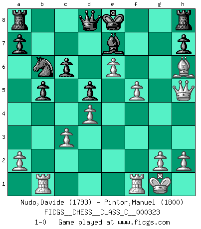 Last move : 1-0 2024 September 8 21:32:59 [Event "FICGS__CHESS__CLASS_C__000323"] [Site "FICGS"] [Date "2024.08.24"] [Round "1"] [White "Nudo,Davide"] [Black "Pintor,Manuel"] [Result "1-0"] [WhiteElo "1793"] [BlackElo "1800"] 1.d4 d5 2.c4 c6 3.Nc3 Nf6 4.Nf3 Bg4 5.Ne5 e6 6.cxd5 exd5 7.Nxg4 Nxg4 8.e4 Nf6 9.e5 Ne4 10.Bd3 Nxc3 11.bxc3 Nd7 12.O-O Be7 13.Rb1 b5 14.Qg4 g6 15.f4 f5 16.Bxf5 gxf5 17.Qh5+ Kf8 18.Qxf5+ Kg7 19.Qg4+ Kf7 20.f5 Nb6 21.e6+ Kf8 22.Bh6+ Ke8 23.Qh5+ 1-0 Follow this game move after move (download)The sign of a great Master is his ability to win a won game quickly and painlessly. (Irving Chernev) Ein guter Spieler hat immer Glück. (José Raúl Capablanca) Con el tiempo, empecé a progresar en partidas decisivas. Tal vez porque me di cuenta de una simple verdad: no solo estaba yo nervioso sino también mi oponente. (Mikhail Tal) Toute estimation doit être constamment réévaluée. (Jacob Estrin) Question: Is 'This statement is paradoxical' a paradoxical statement ? Or is it a meta-paradox ? (Normajean Yates)